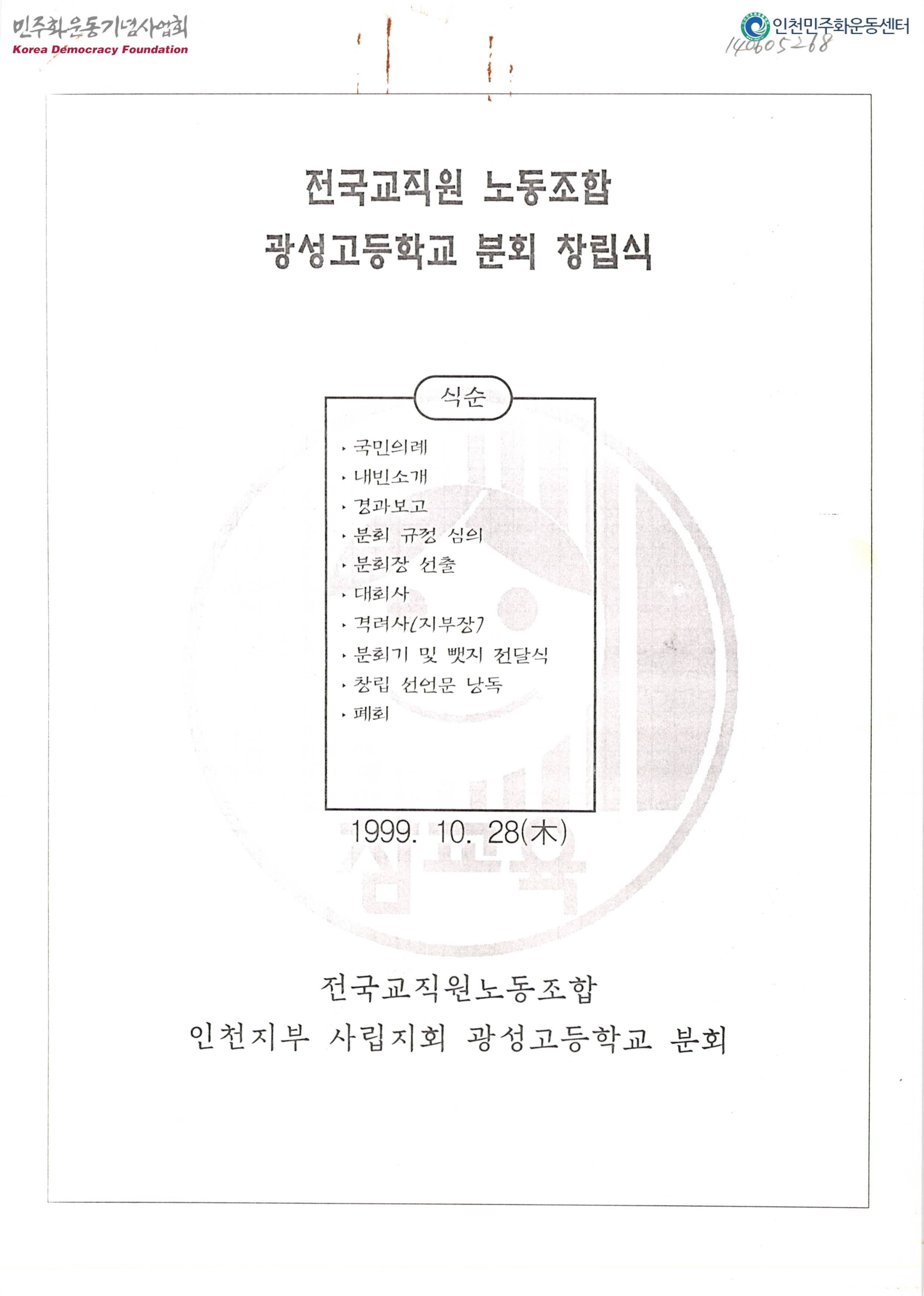- 시대적 소명에 부응하고, 교육 발전에 적극 동참하고자 창립한 광성고등학교 분회의 창립식 자료집으로 수록된 글은 다음과 같음 -식순 -경과보고 -대회사 -전국교직원노동조합 광성고등학교 분회 회칙 -우리의 결의와 만세 삼창