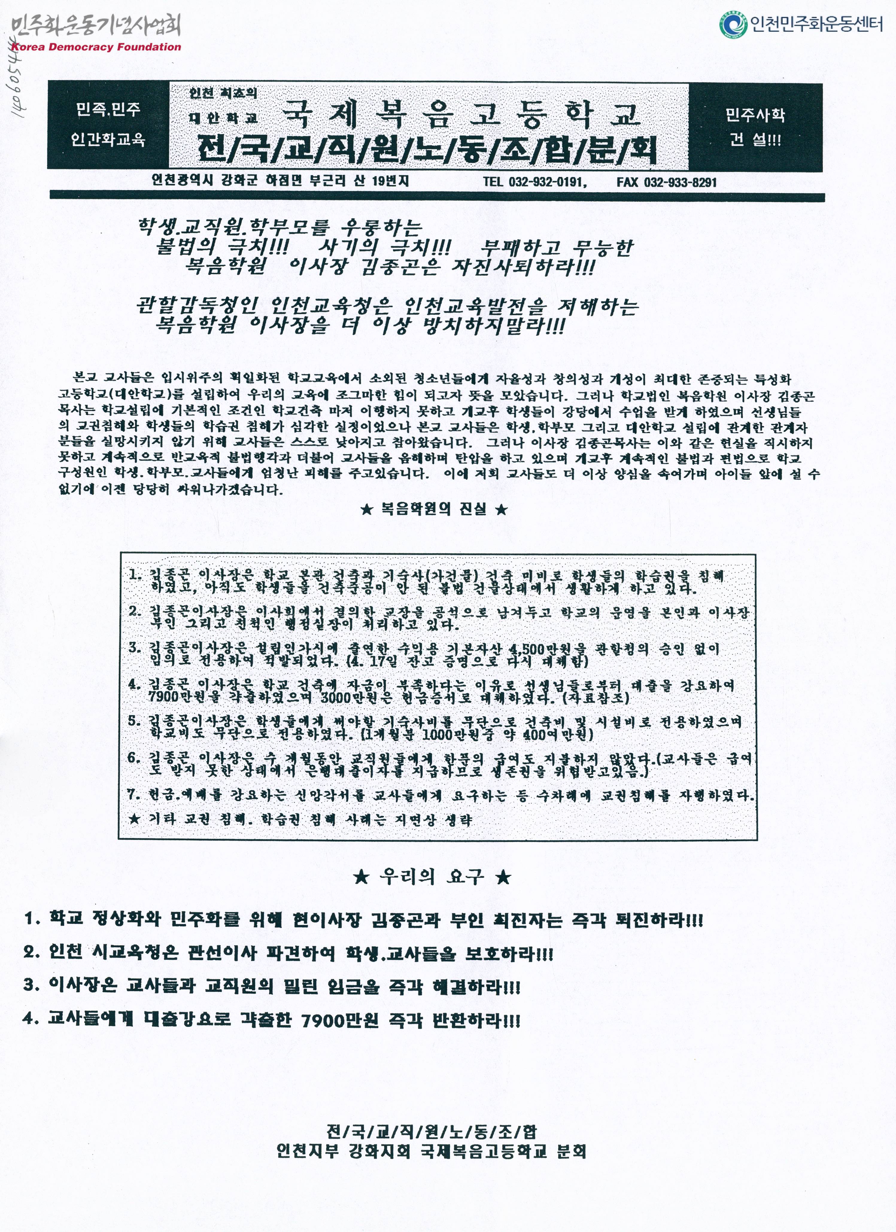 - 복음학원 이사장 김종곤 목사가 학교설립에 기본적인 조건인 학교 건축마저 이행하지 못하고 교권이 침해당하는 상황에서도 계속적으로 반교육적 불법행각과 더불어 교사들을 음해하며 탄압을 하고 있다고 말하며 학교 정상화를 위해 현 이사장과 부인 최진자의 즉각 퇴진, 관선이사를 파견하여 학생과 교사들을 보호할 것, 밀린 임금의 즉각 해결, 각출한 7900만원의 즉각 반환을 요구하는 내용의 문서