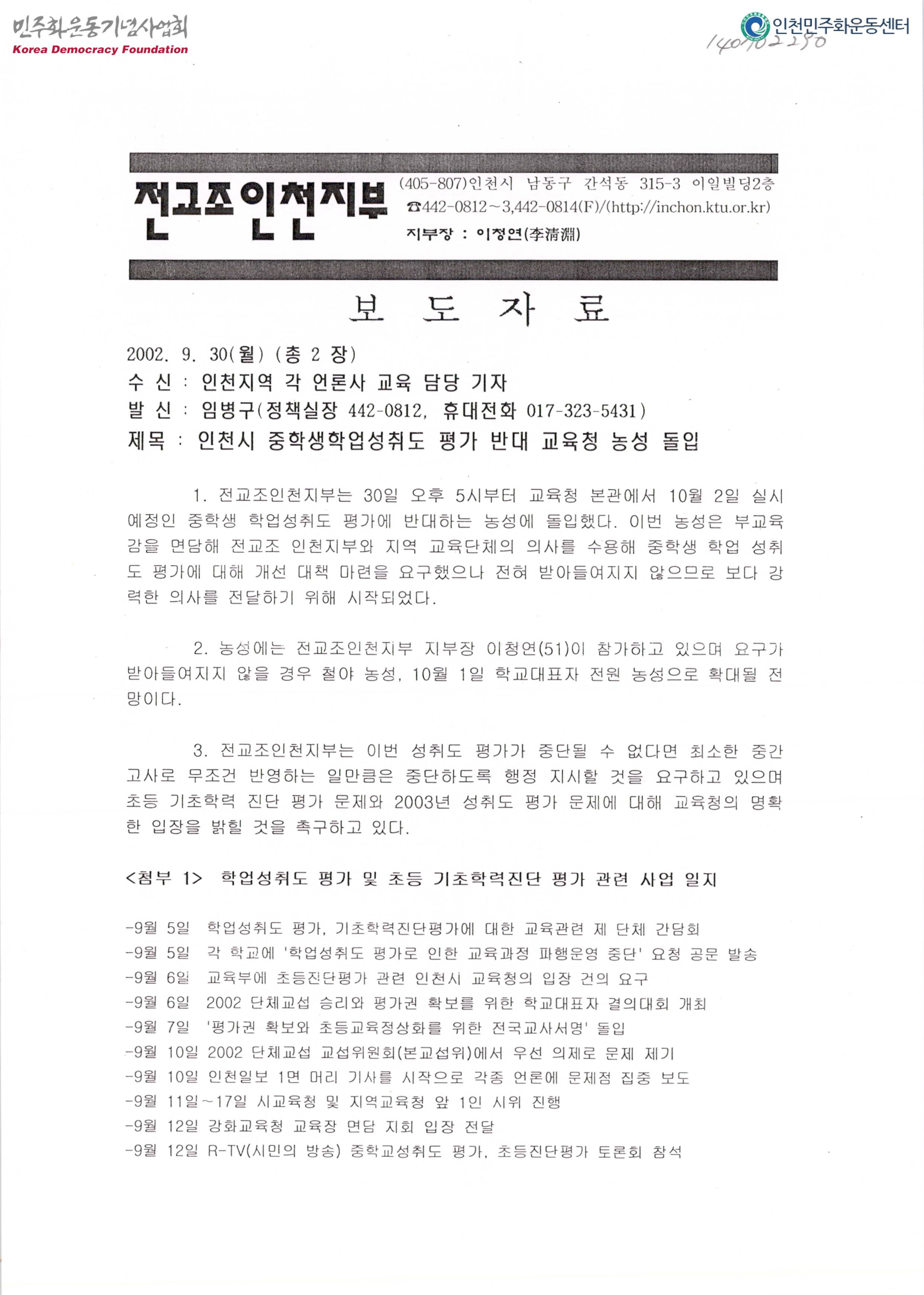 - 전교조 인천지부가 교육청 본관에서 10월 2일 실시예정인 중학생 학업성취도 평가에 반대하는 농성에 돌입했으며 요구가 받아들여지지 않을 경우 철야농성, 전원농성으로 확대될 전망이라는 내용의 보도자료로 학업성취도 평가 및 초등 기초학력진단 평가 관련 사업일지, 전교조 인천지부 지도장 농성 돌입 성명서가 첨부됨