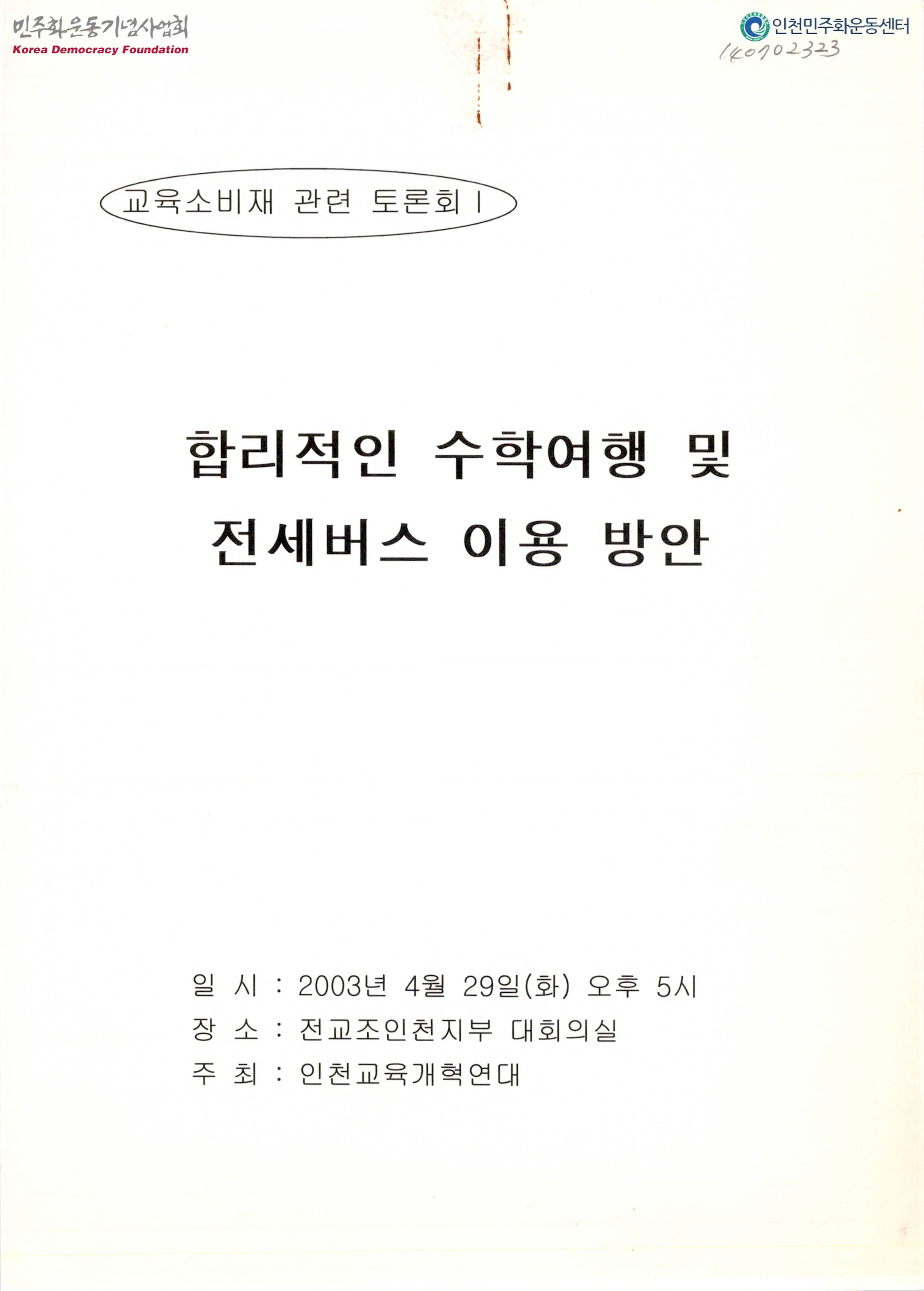 - 인천시 학교의 합리적인 수학여행을 위한 송기윤의 발제문이 수록된 토론회 문서로 식순은 다음과 같음 -발제 : 송기윤 -질의응답 -토론 -전체토론