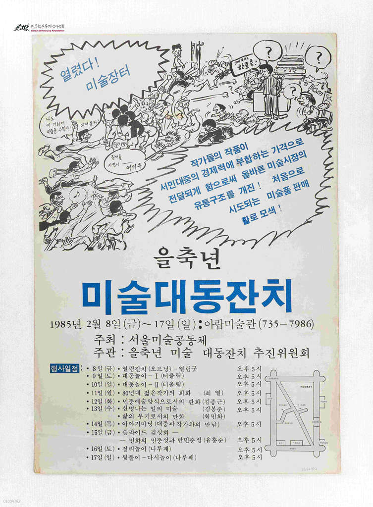 - 1985년 2월 8일부터 17일까지 아랍미술관에서 서울미술공동체 주최, 을축년 미술 대동잔치 추진위원회가 주관하여 진행하는 을축년 미술대동잔치 홍보 포스터로 행사일정과 약도가 있음