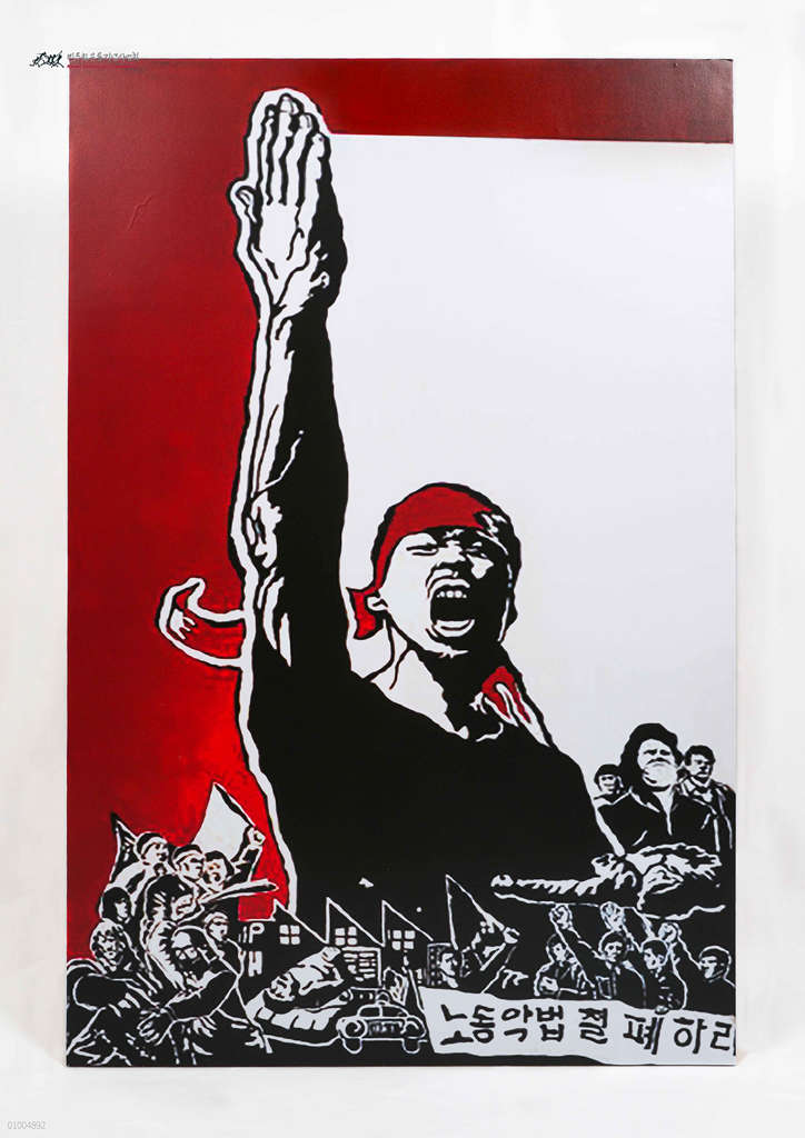 - 1989년 연세대 노천극장에서 열린 '전태일 열사 정신계승, 노동악법 철폐 및 전노협 건설을 위한 전국노동자대회'의 무대 걸개로 항의하는 노동자의 모습이 그려져 있음