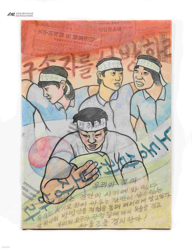 - 구속자를 석방하라, 노동삼권 보장하라 등의 표어와 어깨동무한 사람들이 그려져 있음