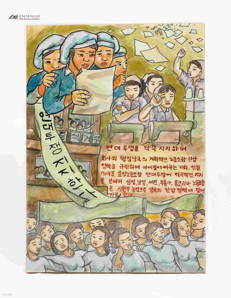 - 연대투쟁지지한다라는 글씨가 쓰인 현수막과 어깨동무한 사람들, 성명서를 읽는 사람들이 그려져 있음