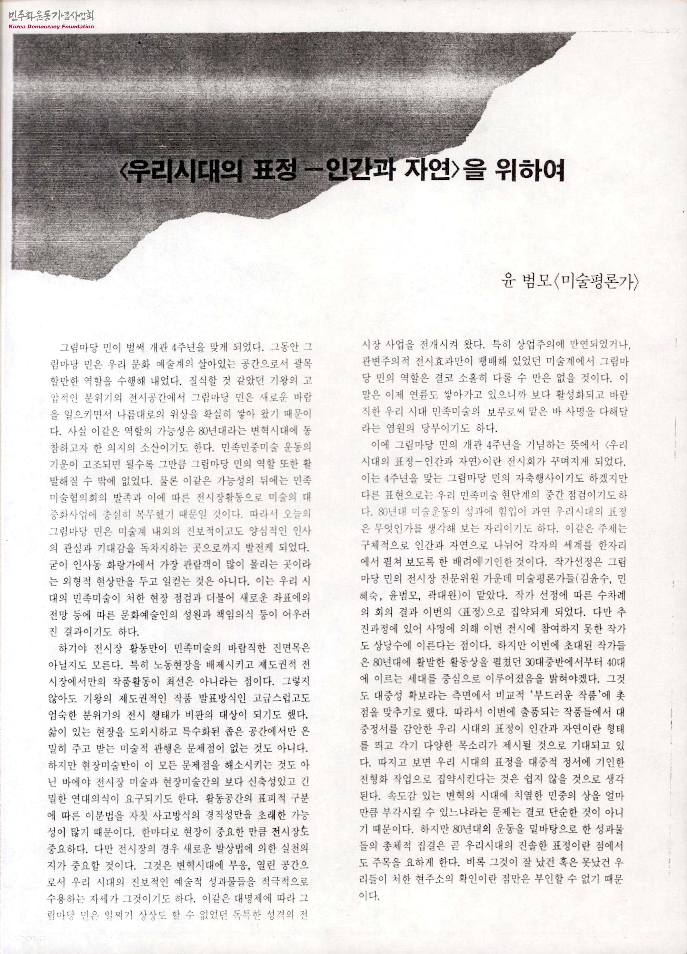 - 1980년대 민족 예술운동의 전시를 도맡았던 그림마당 민이 개관 4주년을 맞아, 80년대 운동의 집결은 우리시대의 진솔한 표정이라는 내용의 주제로 기념 전시회를 개최한다는 내용의 글