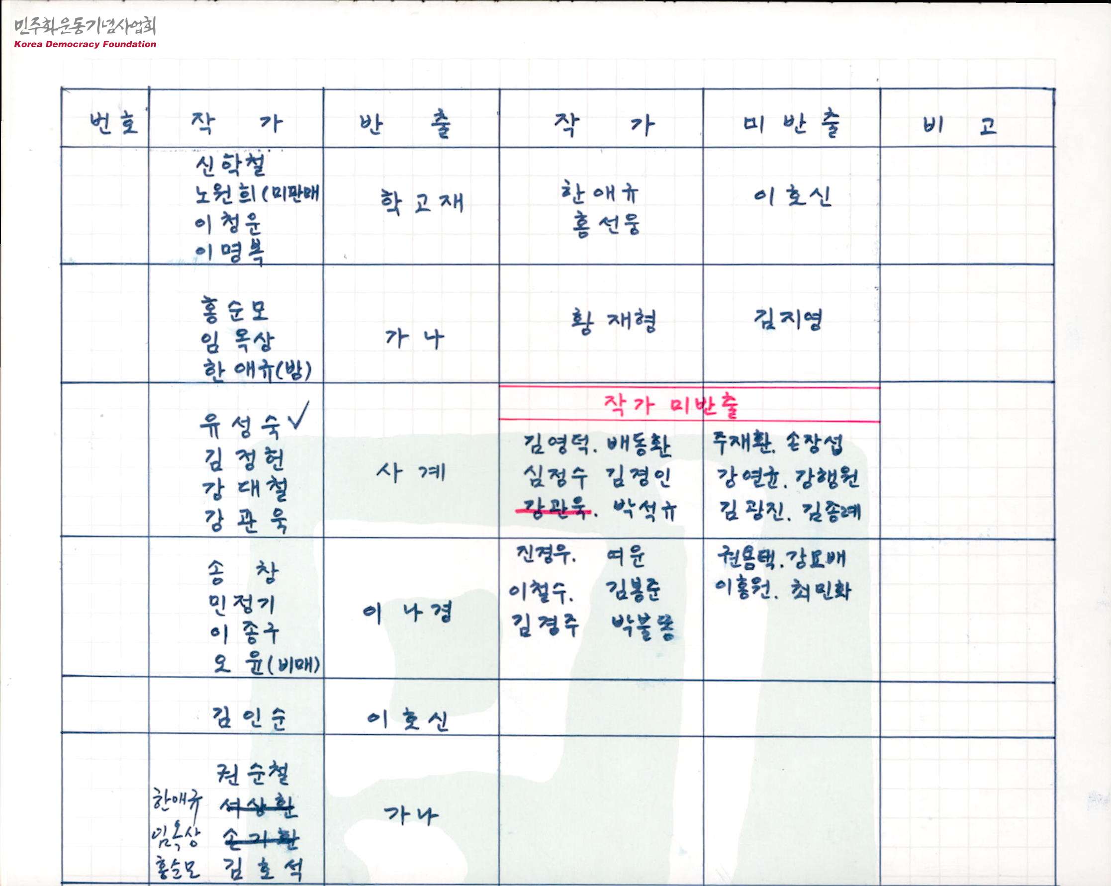 - 민족미술협의회에서 단체전 개최를 위해 소속 작가들의 작품을 소장하고 있는 화랑과의 작품 반출 가능여부 내용을 정리한 표로 추정