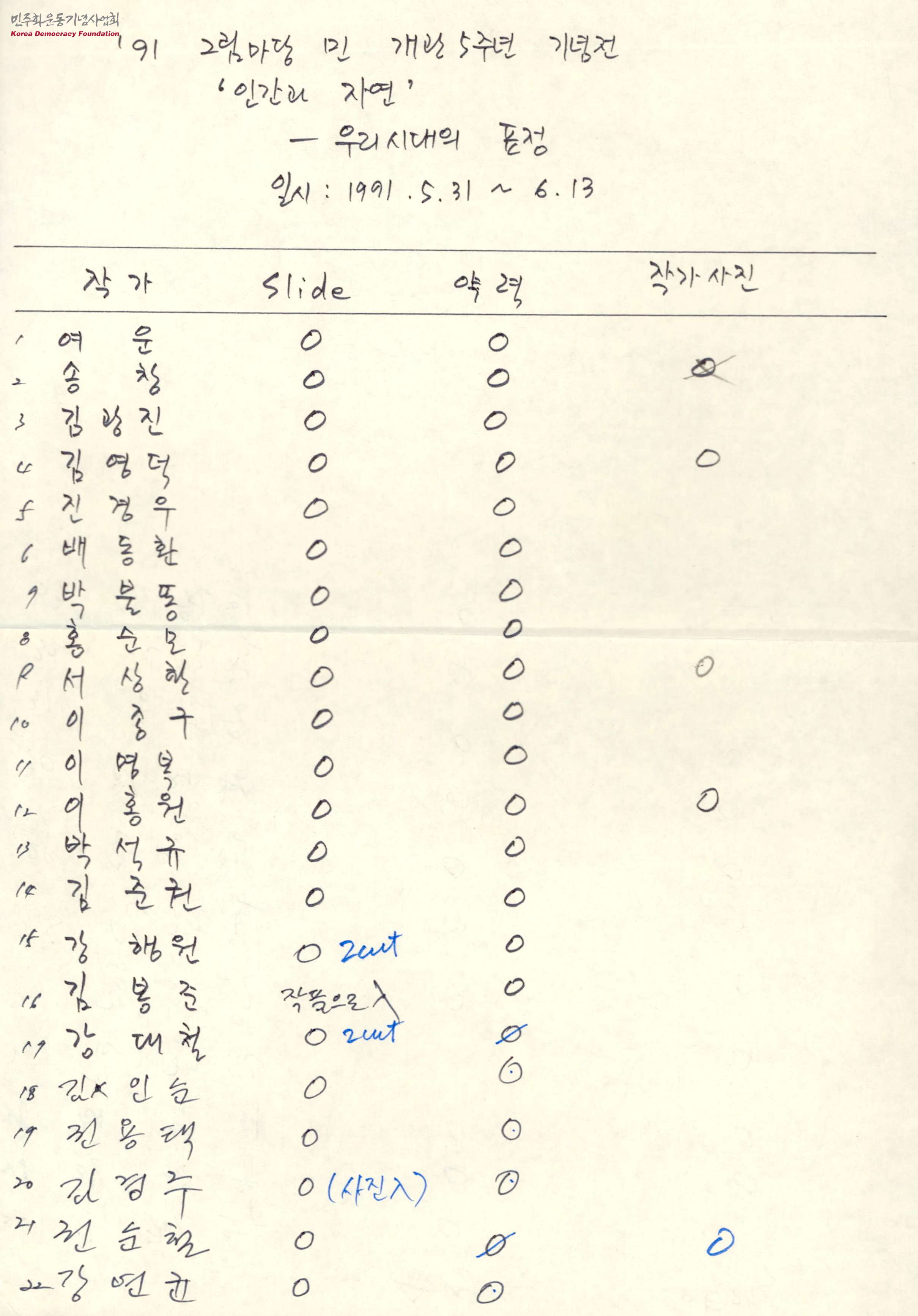 - 그림마당 민 개관 5주년 기념전 카탈로그를 제작하기 위해서 초대 작가별 슬라이드, 약력 조사, 그리고 작가의 사진 등의 현황을 정리한 내용의 글