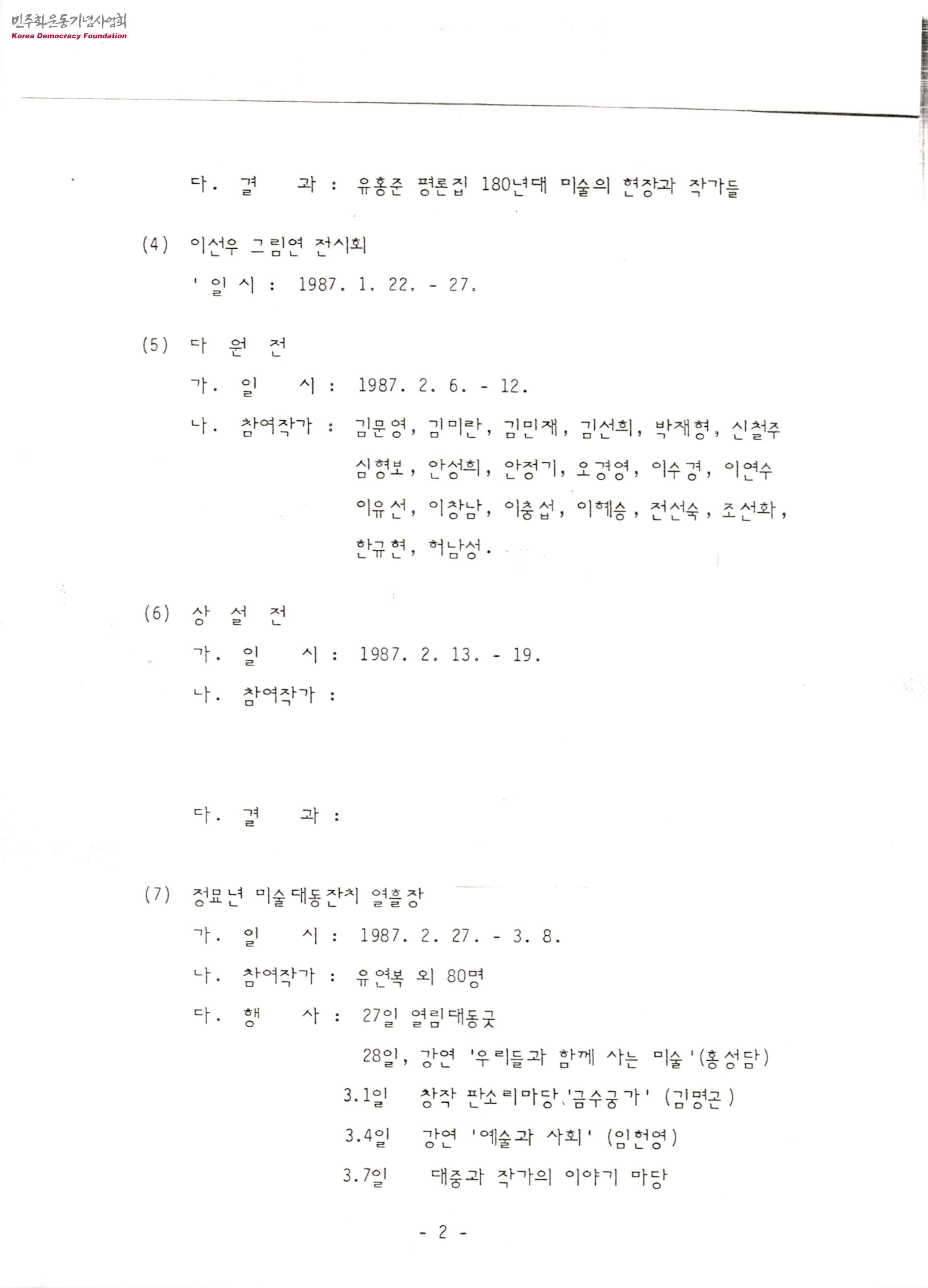 - 1987년 사업 일정 및 계획의 내용이 담긴 문서로, 이선우 그림연 전시회, 정묘년 미술대동잔치 열흘장, 가는패 열림전, 엽서제작, 판화판매사업, 민족미술학교 개설, 벽화분과 세미나 등을 계획하는 내용이 포함되어 있음