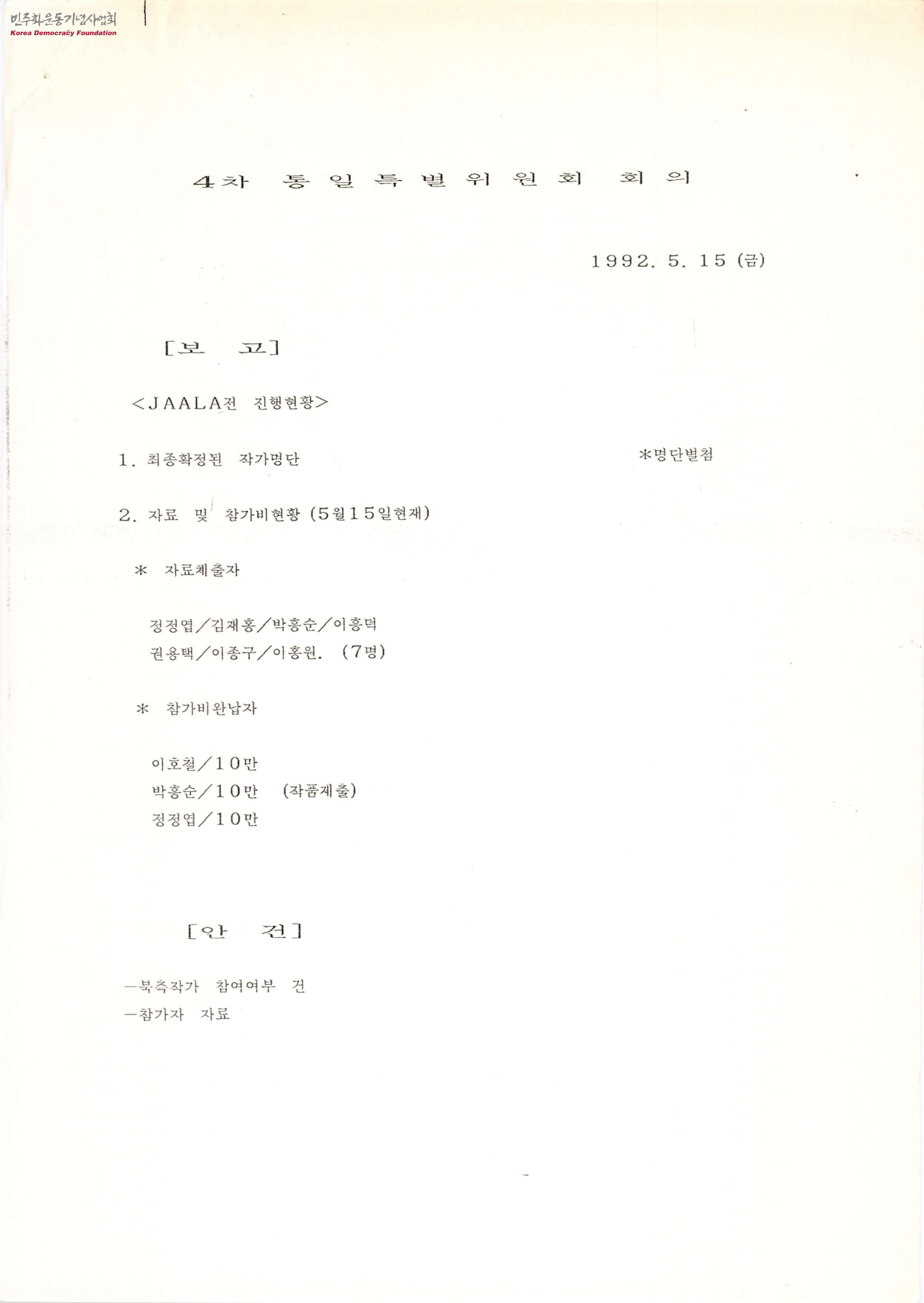 - 일본의 동경 미술관에 JAALA(일본·아시아·아프리카·라틴아메리카 미술가회) 주최로 1992년 7월 열리는 「제3세계와 우리들展」의 진행현황에 대한 회의를 진행했으며, 최종확정된 작가 명단, 자료 및 참가비 현황 등에 대해 회의한 내용의 문서
