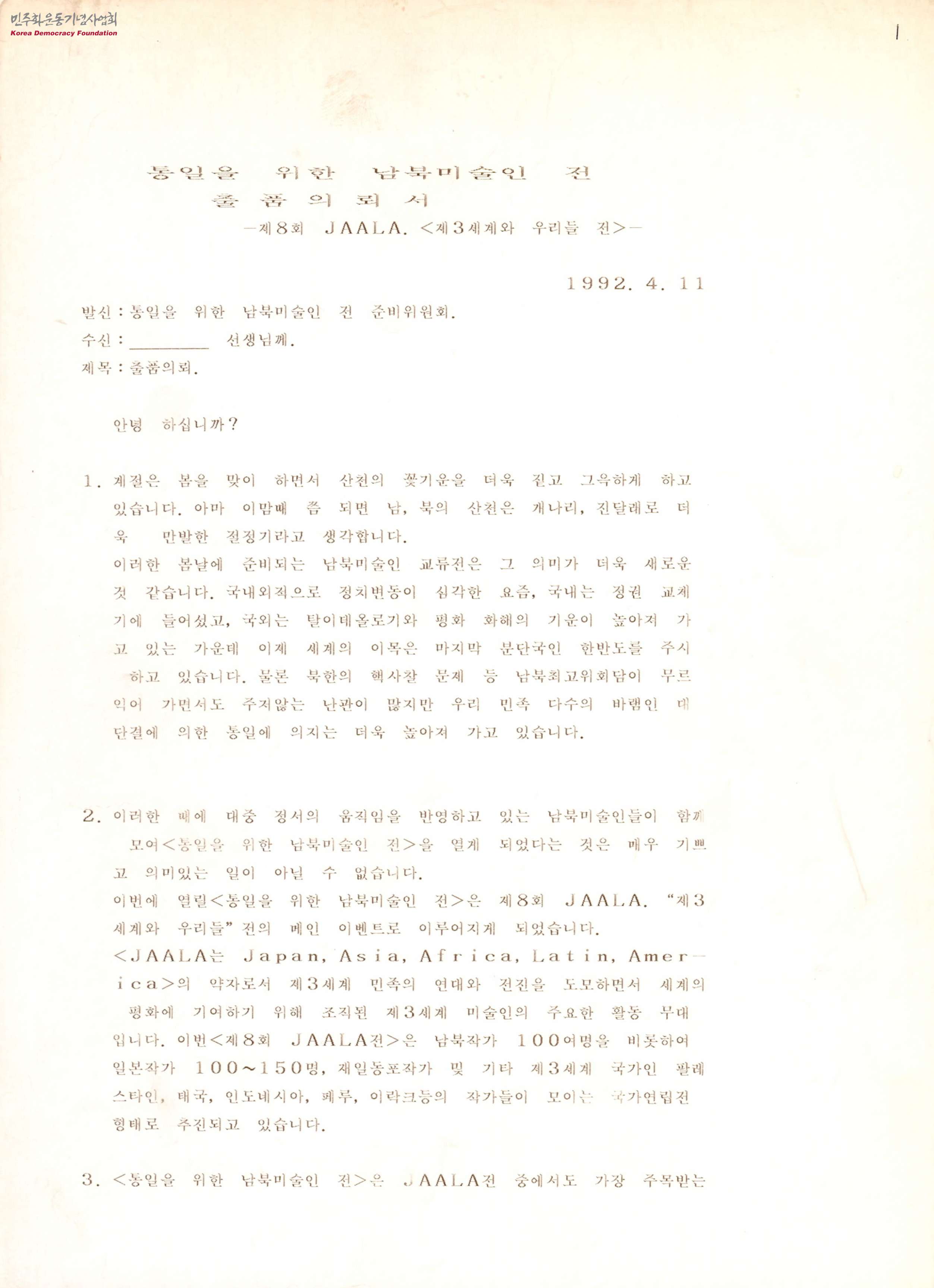 - 통일의 바람이 점점 커져가는 상황에서 '통일을 위한 남북미술인 전'을 열게 되었고, 해당 전시는 JAALA 주최 전시의 메인 이벤트로 개최하게 되어 큰 주목을 받는 전시가 될 것이기에, 작가들에게 신작을 출품해 줄 것을 요구하는 내용이 담긴 글