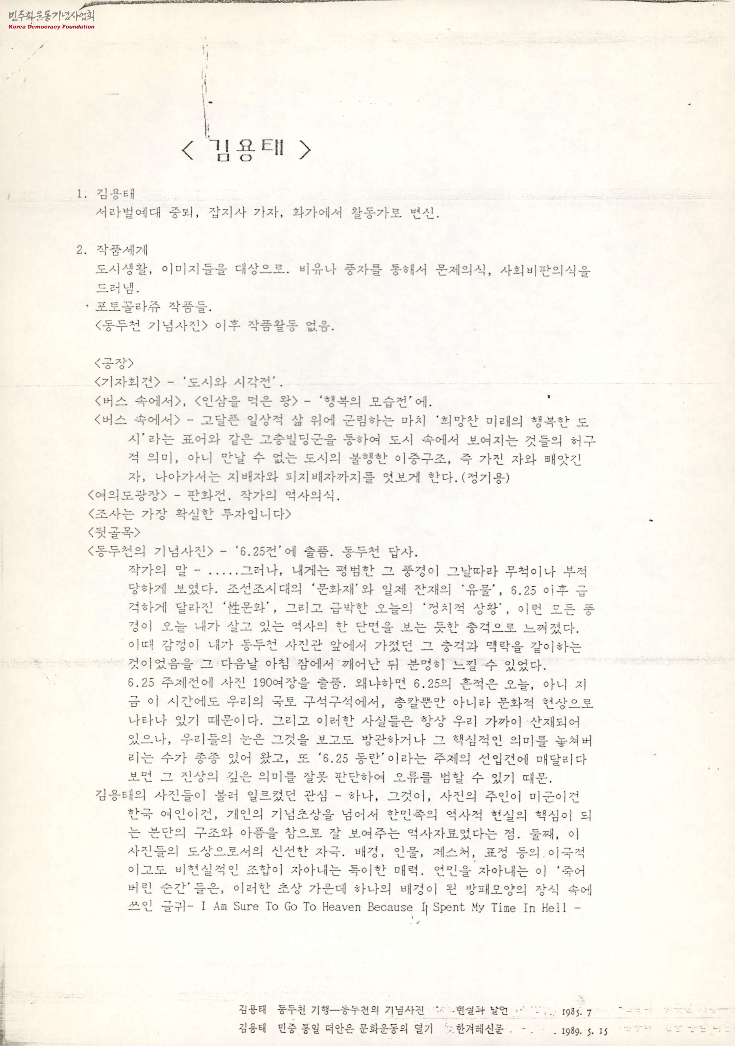 - 화가에서 활동가로 변신한 김용태 작가의 특징을 정리한 글로, 그의 작품은 도시생활, 이미지들을 대상으로 비유나 풍자를 통해서 문제의식, 사회비판의식을 드러내는 특징을 가지고 있으며, 그가 출품한 각 작품에 대한 평가 및 특징을 분석하여 정리한 글