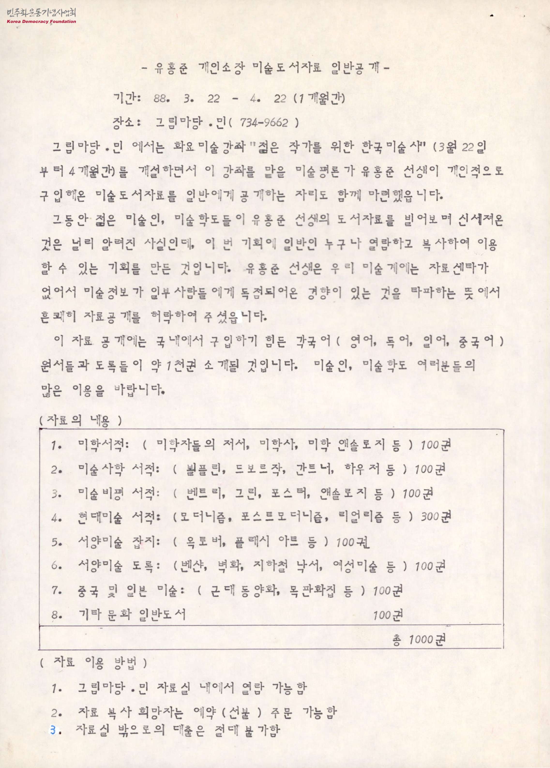 - 미술마당 민에서 화요미술강좌를 개설하면서 해당 강좌를 맡은 미술평론가 유홍준 선생이 개인적으로 구입해온 미술도서자료를 일반에게 공개하는 자리도 마련하였음을 알리는 내용과 국내에서 구입하기 힘든 자료도 다량 포함되어 있음을 알리는 내용의 문서