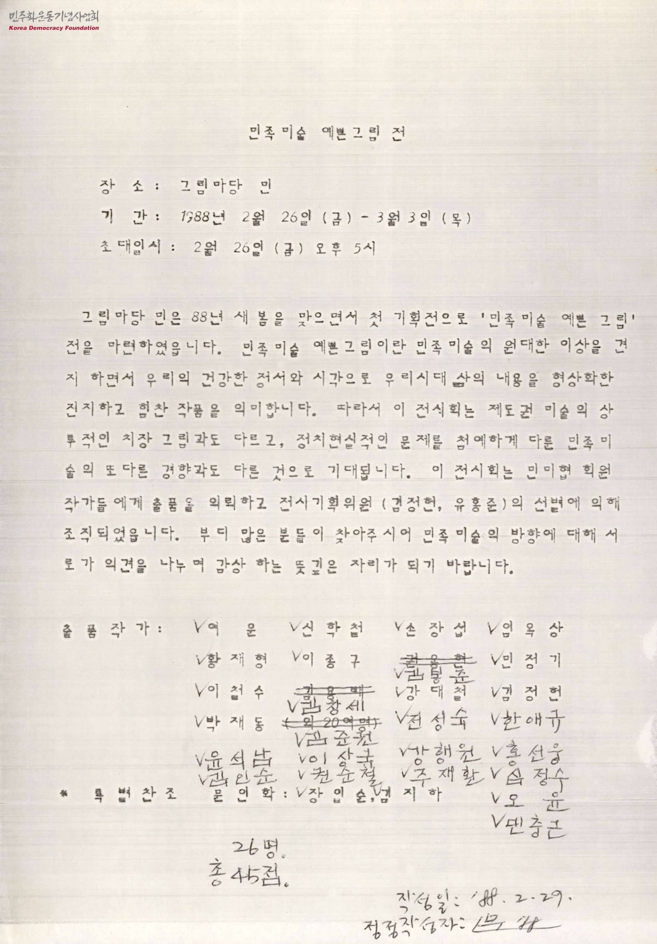 - 그림마당 민은 1988년 새 봄을 맞이하면서 첫 기획전으로 '민족미술 예쁜 그림전'을 마련하였으며, 해당 전시전은 민족미술의 원대한 이상을 견지하면서 우리의 건강한 정서와 시각으로 우리시대 삶의 내용을 형상화한 진지하고 힘찬 작품을 중심으로 선별하였기에, 많은 분들이 참여하여 다같이 민족미술의 방향에 대해 의견을 나누는 뜻깊은 자리가 되었으면 좋겠다는 내용의 문서