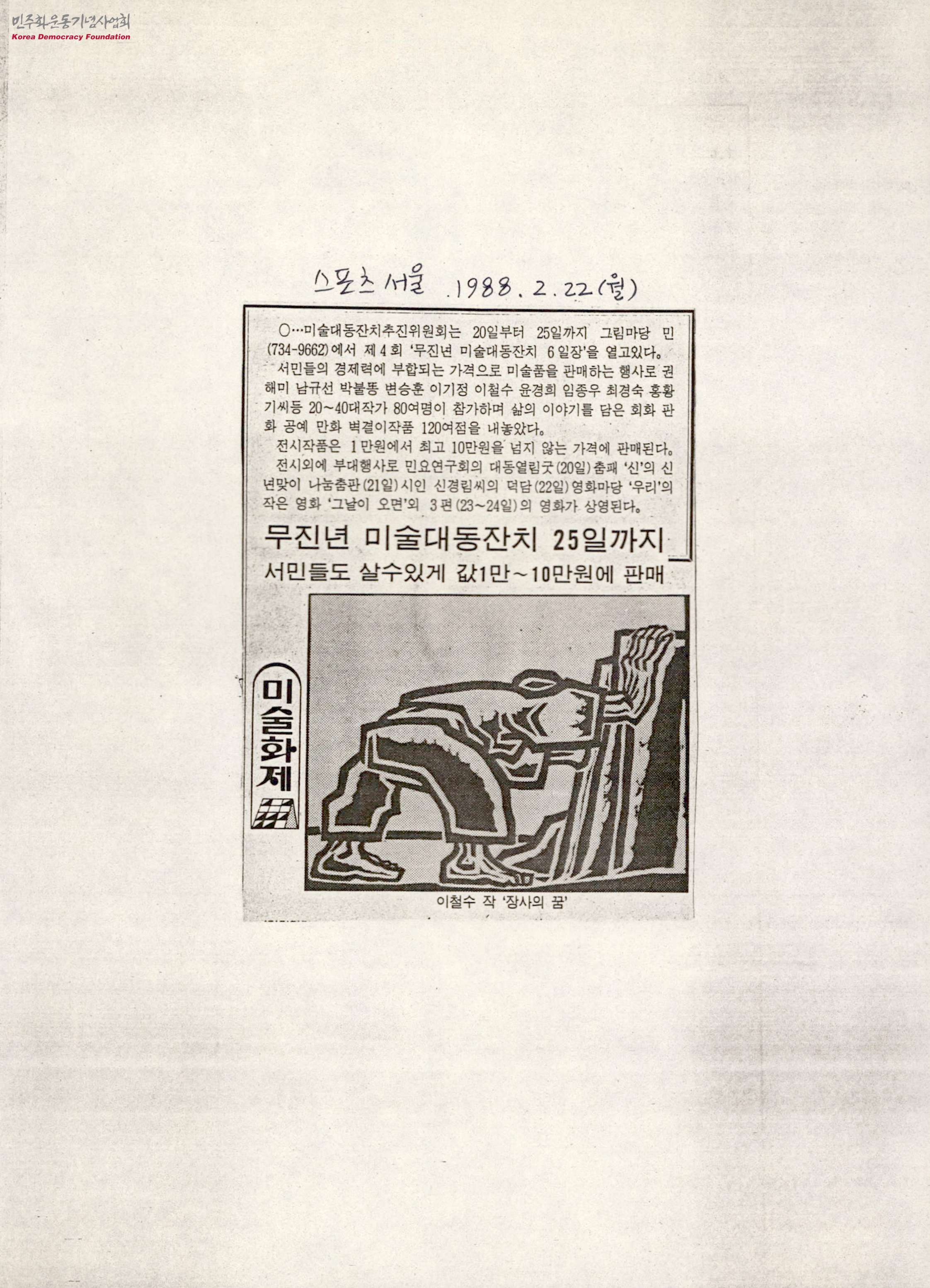 - 1988년 2월 20일부터 25일까지 그림마당 민에서 제4회 무진년 미술대동잔치 6일장이 열리고 있으며, 해당 잔치에서는 서민들의 경제력에 부합하는 가격으로 미술품을 판매하는 행사로 권해미 등 80여 명의 작가가 작품 120여 점을 내놓았고, 그 외에도 대동열림굿, 춤판, 덕담, 영화 상영 등의 행사도 준비하고 있다는 내용의 신문스크랩