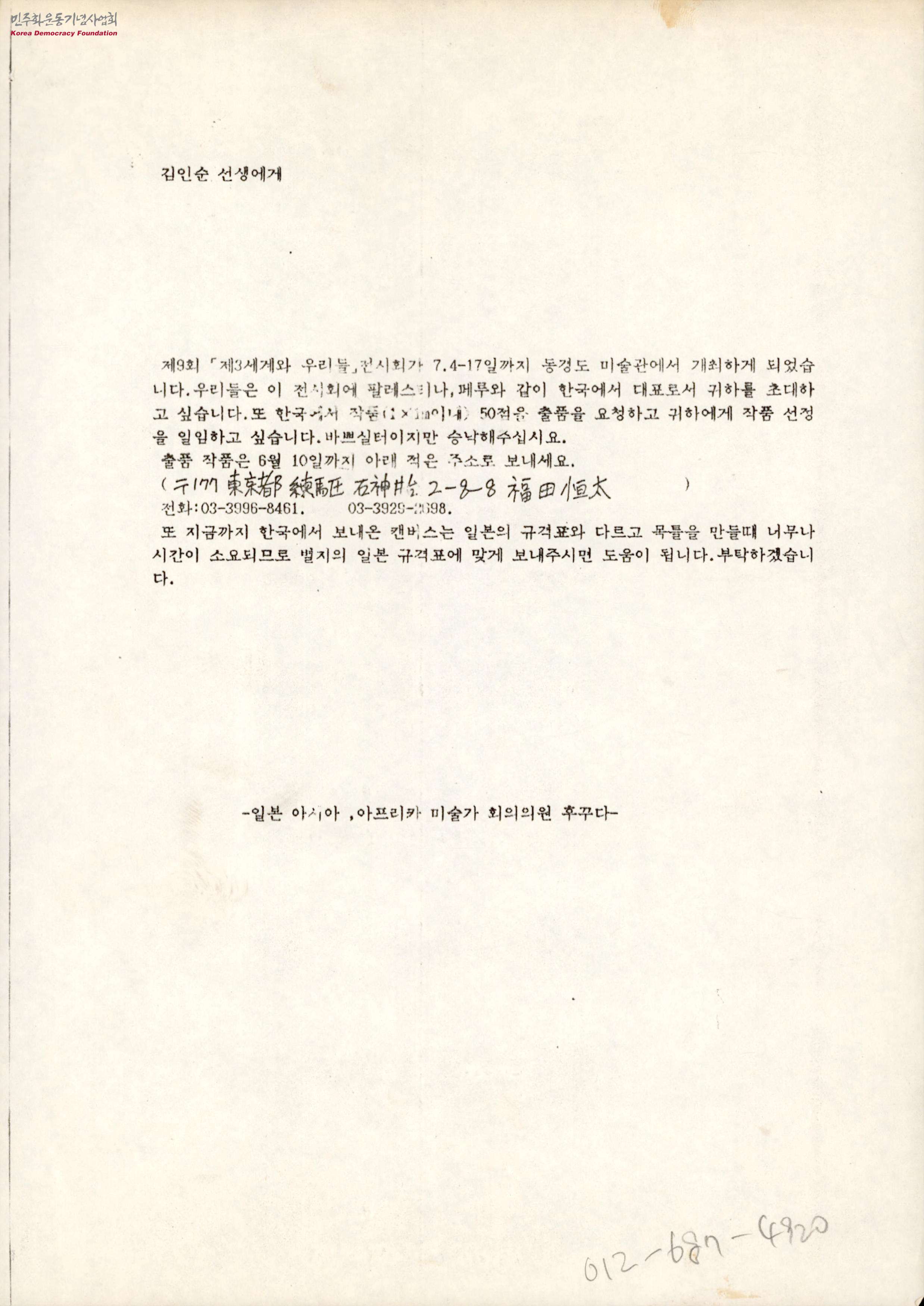 - 일본 아시아, 아프리카, 미술가회의 의원 후꾸다가 김인순 선생에게 보낸 서신으로, 제9회 '제3세계와 우리들'전시회가 동경도 미술관에서 개최하기로 하였으니, 한국 대표로 참가해 주기를 바라는 내용이 담겨 있음
