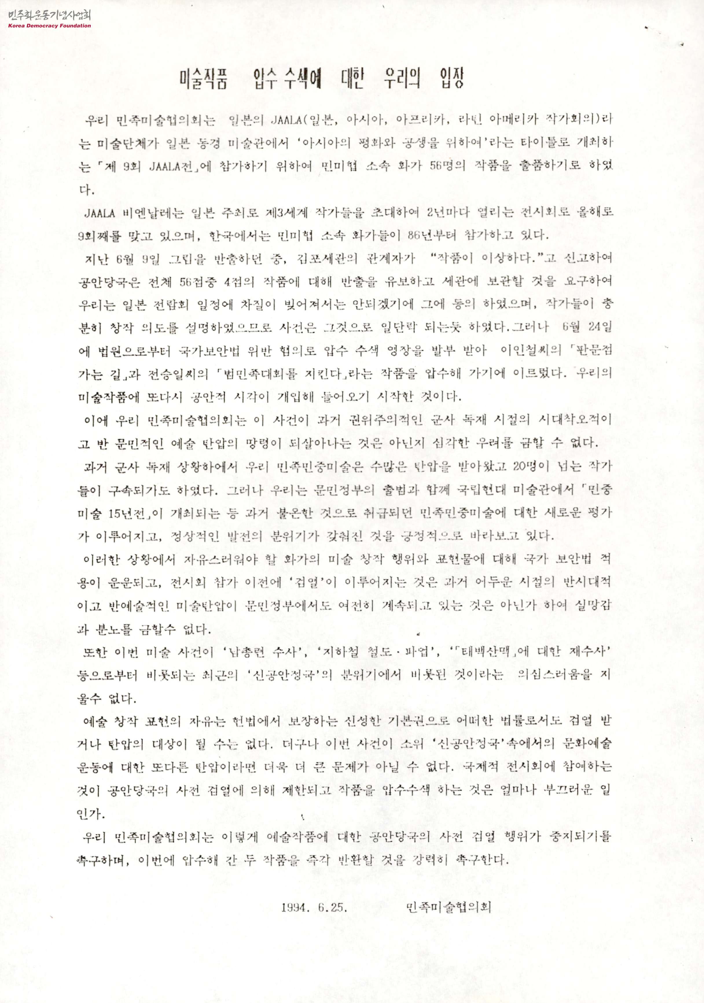 - 민족미술협의회는 JAALA가 주최하는 전시회에 56점의 작품을 출품하기로 하였으나 김포세관 관계자가 작품이 수상하다고 하여 4점의 작품이 압류되는 사건이 발생하였는데, 이후 1994년 6월 24일 법원으로부터 국가보안법 위반 협의로 압수 수색 영장을 발부 받아 두 점의 작품을 압수당하게 되었다는 내용과 예술 창작 표현의 자유는 헌법에서 보장하는 신성한 기본권으로 어떠한 법률로서도 검열 받거나 탄압의 대상이 될 수 없기에 공안당국은 검열을 중지하고 압수한 두 작품을 반환할 것을 촉구하는 내용의 글