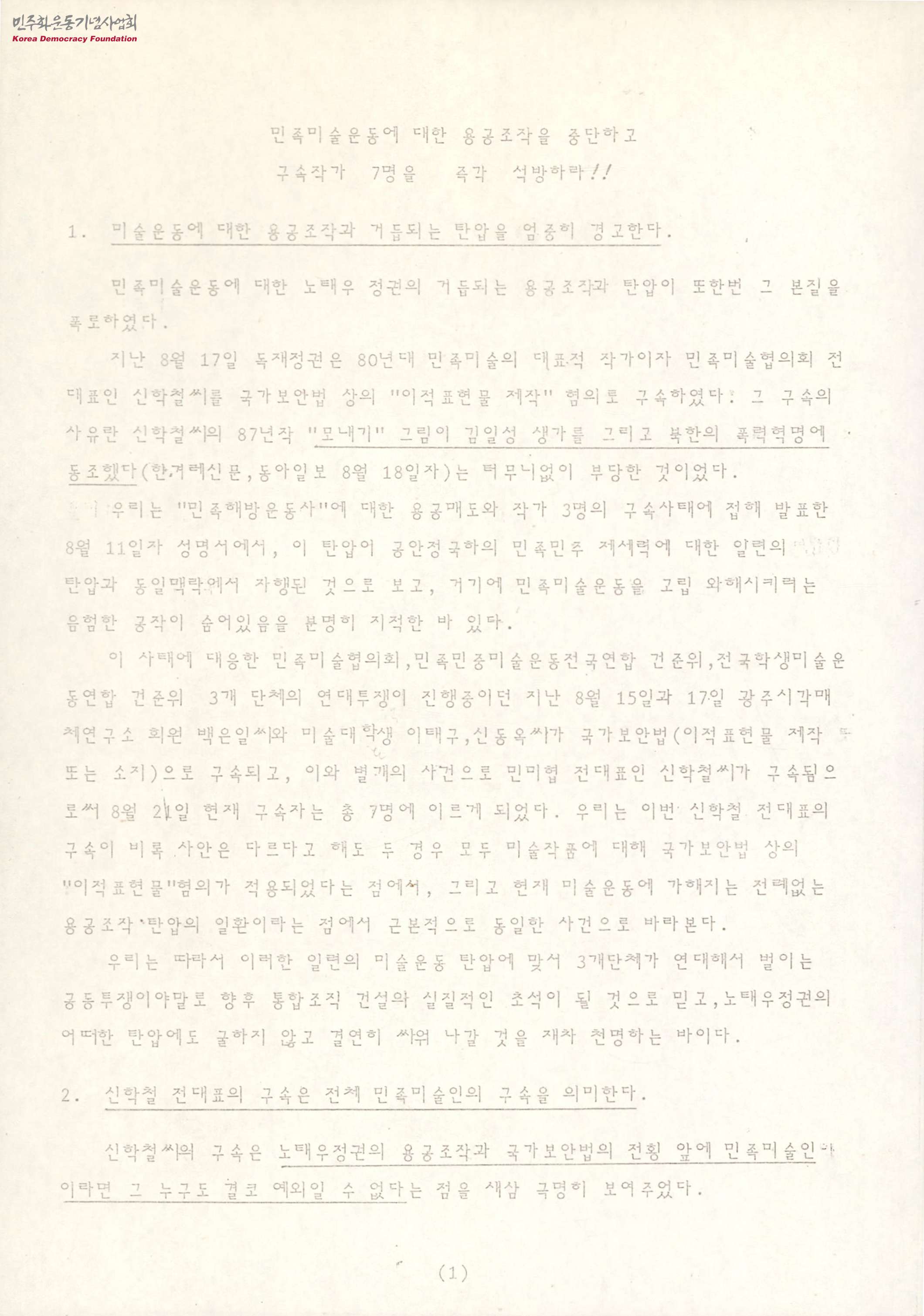 민족미술운동에 대한 용공조작을 중단하고 구속작가 7명을 즉각 석방하라!