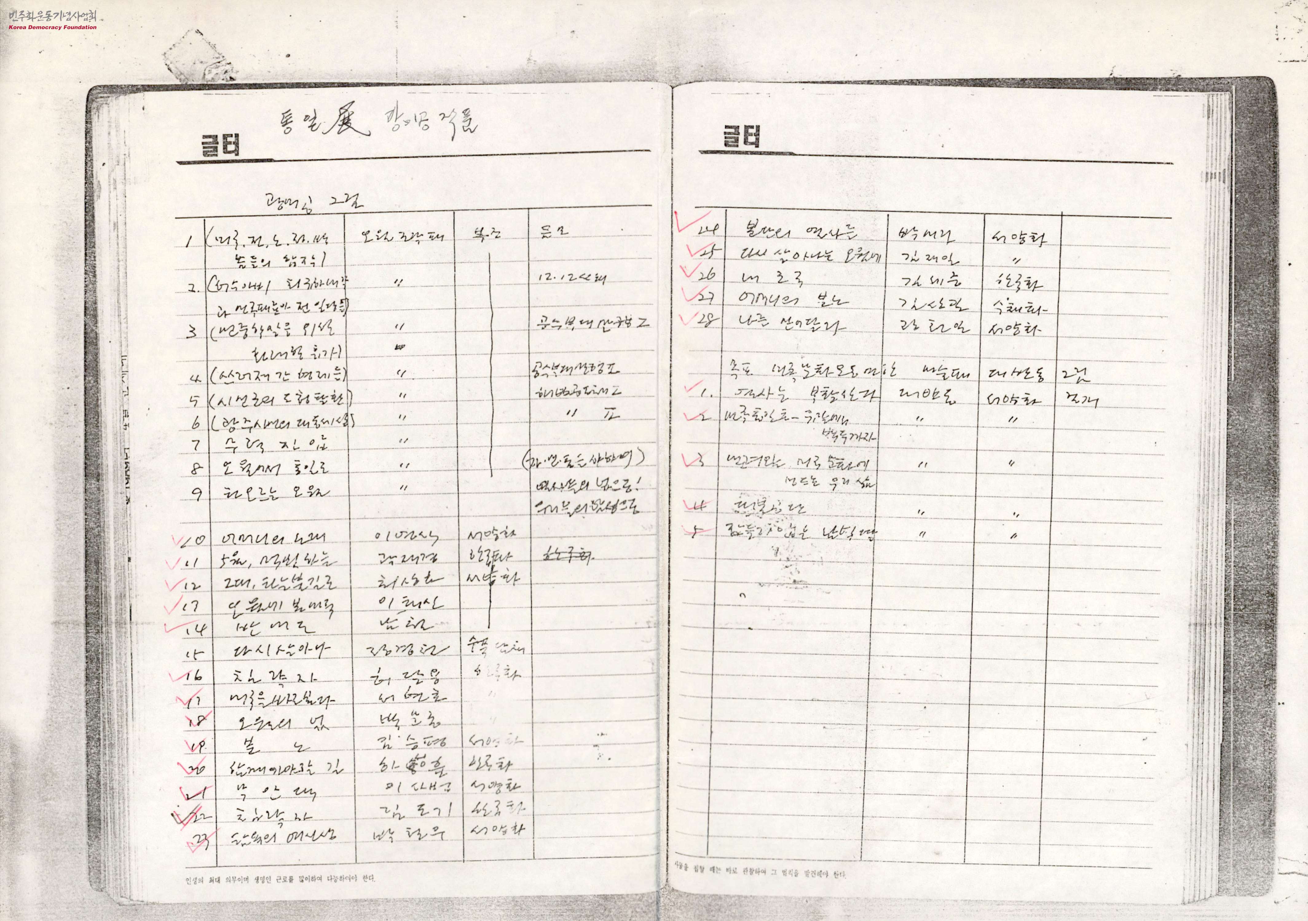 - 통일전을 위해 광주전남미술인공동체 작품을 적어놓은 메모로 33점의 작품 제목과 작가명, 화풍, 기타정보가 담겨 있음