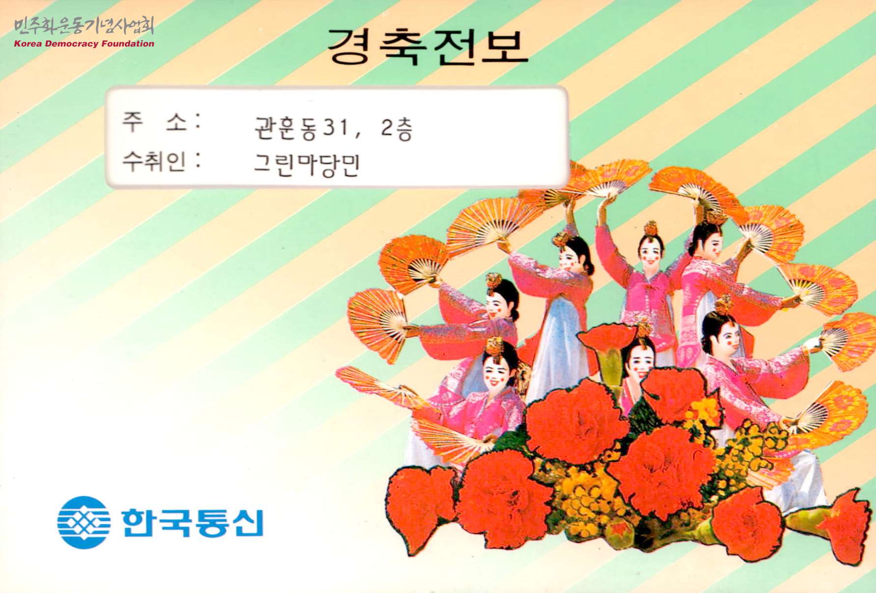 - 이광호가 그림마당 민에게로 보낸 전보로, 전시회 개최를 축하하며 앞으로도 끊임없이 발전하기를 바란다는 내용이 담겨 있음