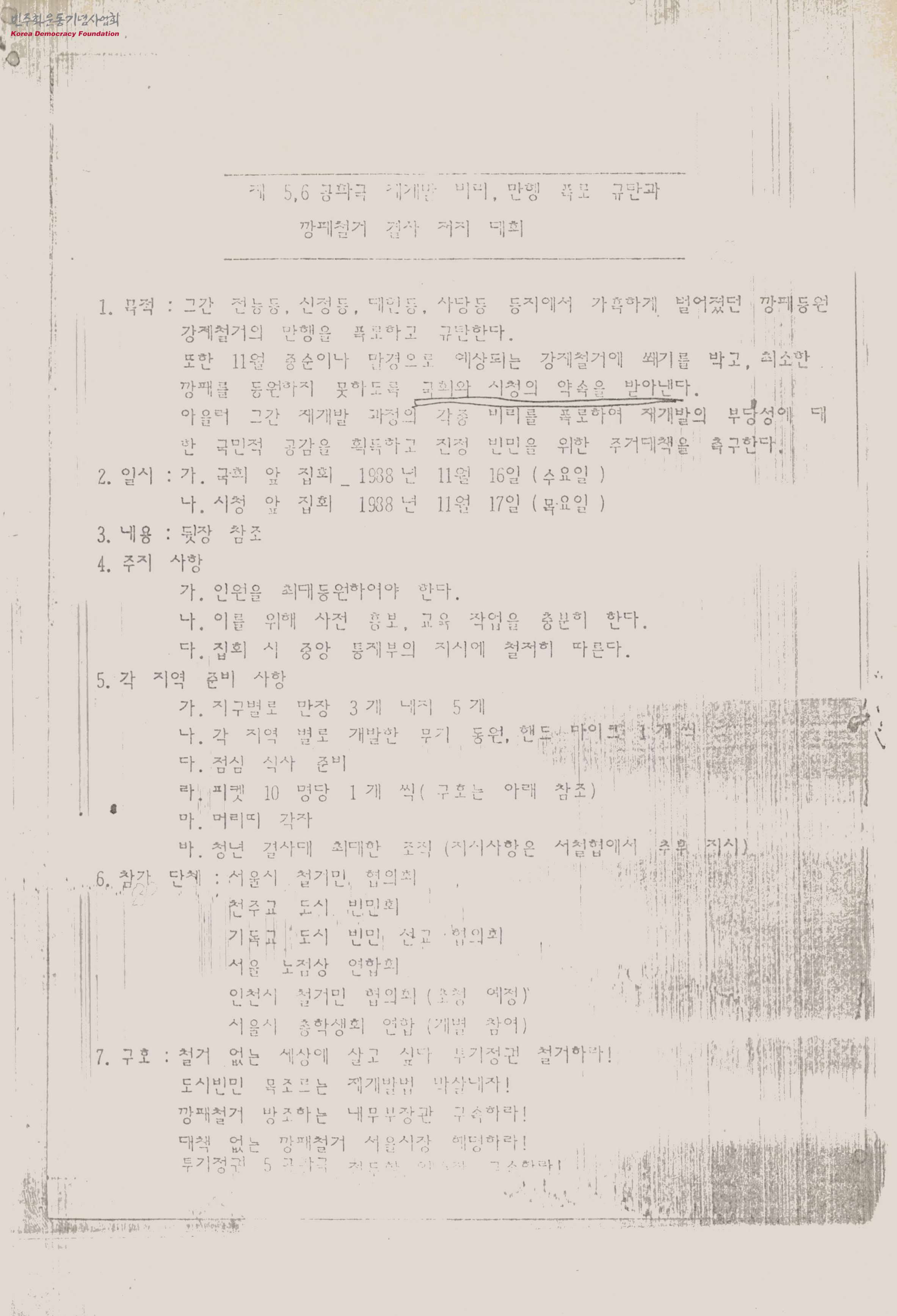- 신정동, 사당동 등지에서 가혹하게 벌어졌던 깡패동원 강제철거의 만행을 폭로하고 규탄하는 시위에 대한 내용의 문서로, 참가 단체와 구호, 일시, 주의사항이 기재되어 있음