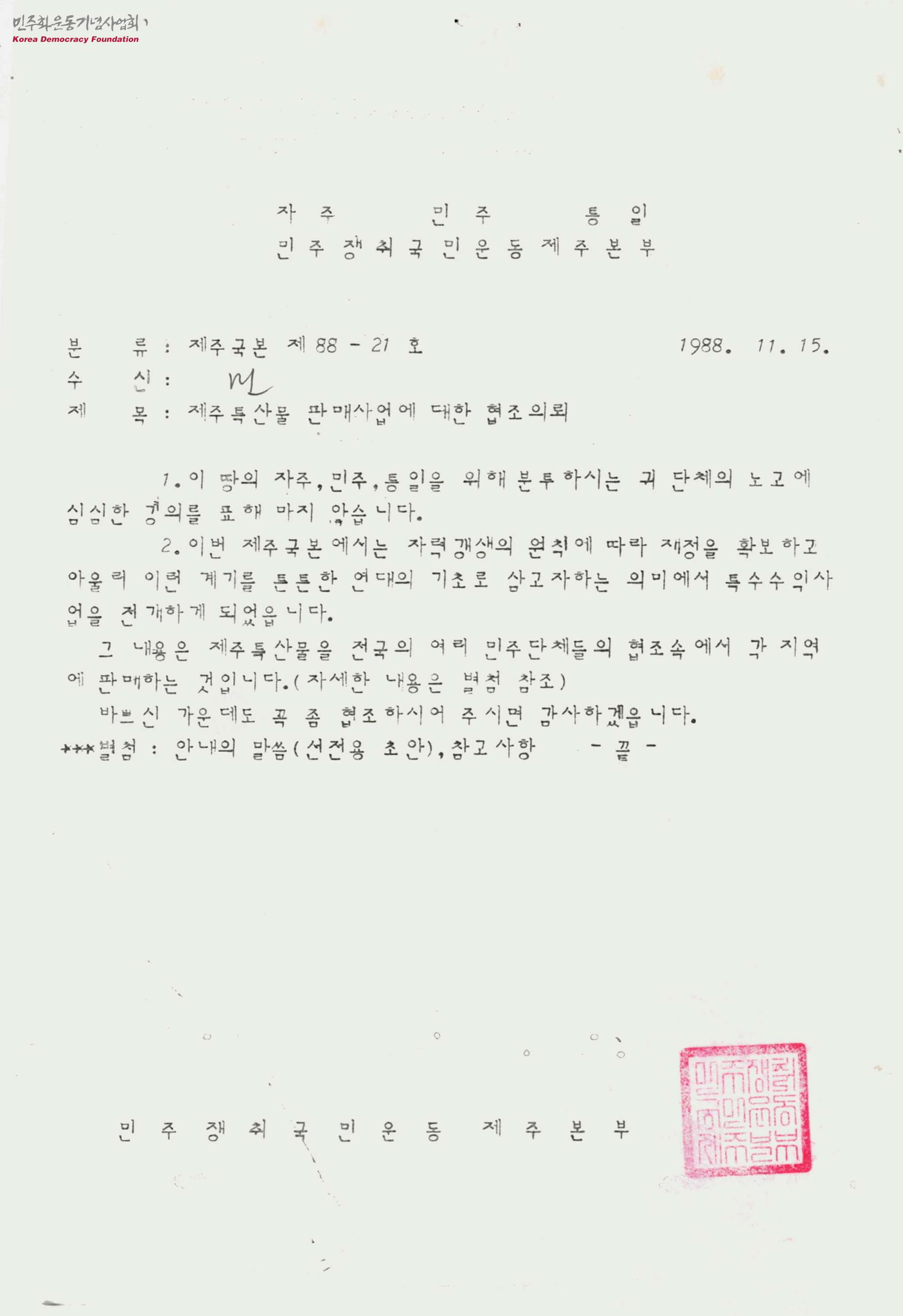 - 자주·민주·통일 민주쟁취국민운동제주본부에서 재정확보사업으로 진행하는 특수수익사업을 협조 의뢰하는 문서로, 여러 단체에게 도움을 요청한 내용들이 포함되어 있음