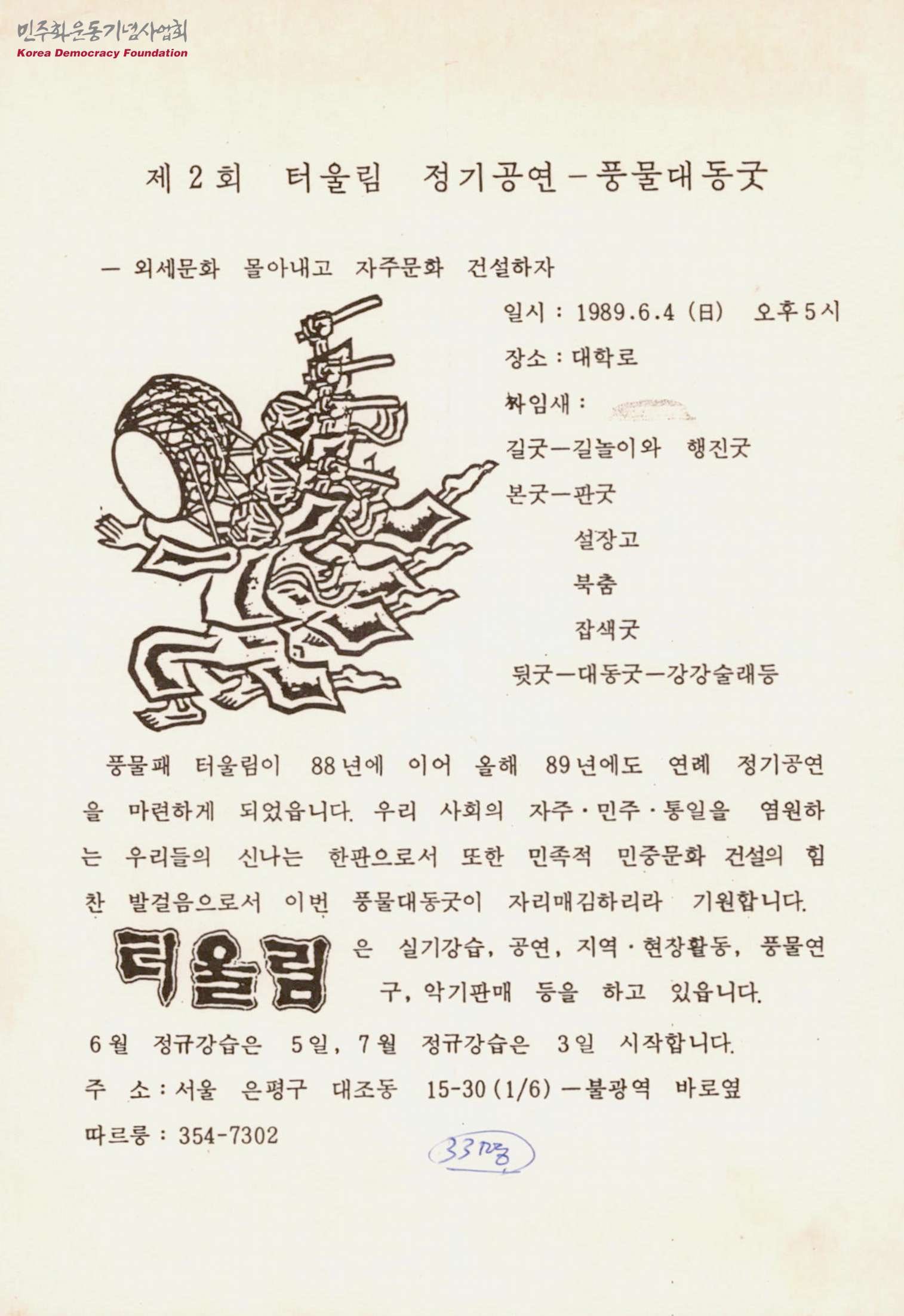 - 외세문화 몰아내고 자주문화 건설하자' 라는 슬로건을 건 터울림의 정기공연에 대한 홍보 리플릿으로, 장소와 날짜 등 공연 정보가 포함되어 있음