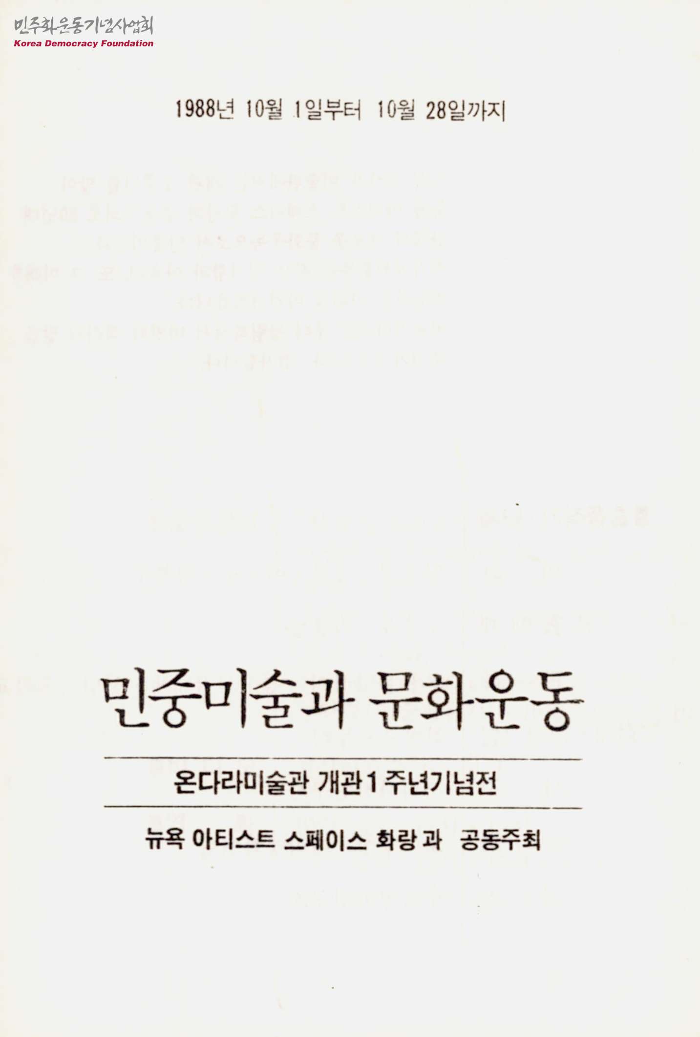 - 온다라 미술관 개관 1주년을 맞이하여 뉴욕 아티스트 스페이스 화랑과 공동주최로 80년대 한국의 새로운 문화운동으로서 민중미술과 시간매체운동을 정리·평가하는 기념전에 초대하는 초대장