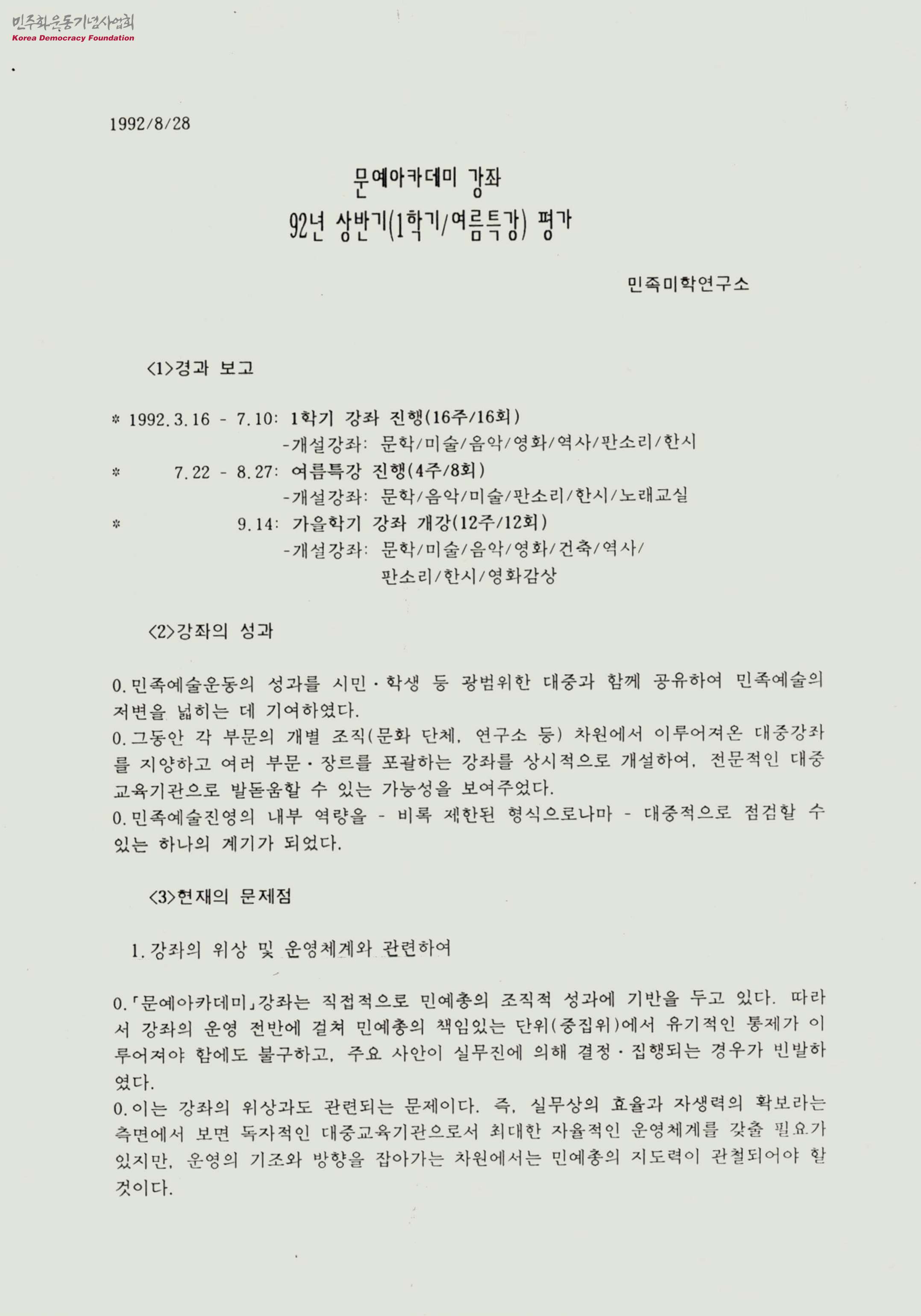 - 민족미학연구소 산하 문예아카데미 강좌 92년 상반기에 대한 평가를 보고하는 문서로, 강좌의 성과와 현재 위상과 운영체계, 재정 등과 관련된 문제점을 제시와 이에 대한 대안으로 독자적 운영체계 구축, 강좌사업에 대한 광범위한 지지세력 확보를 위해 노력해야한다는 내용이 담김