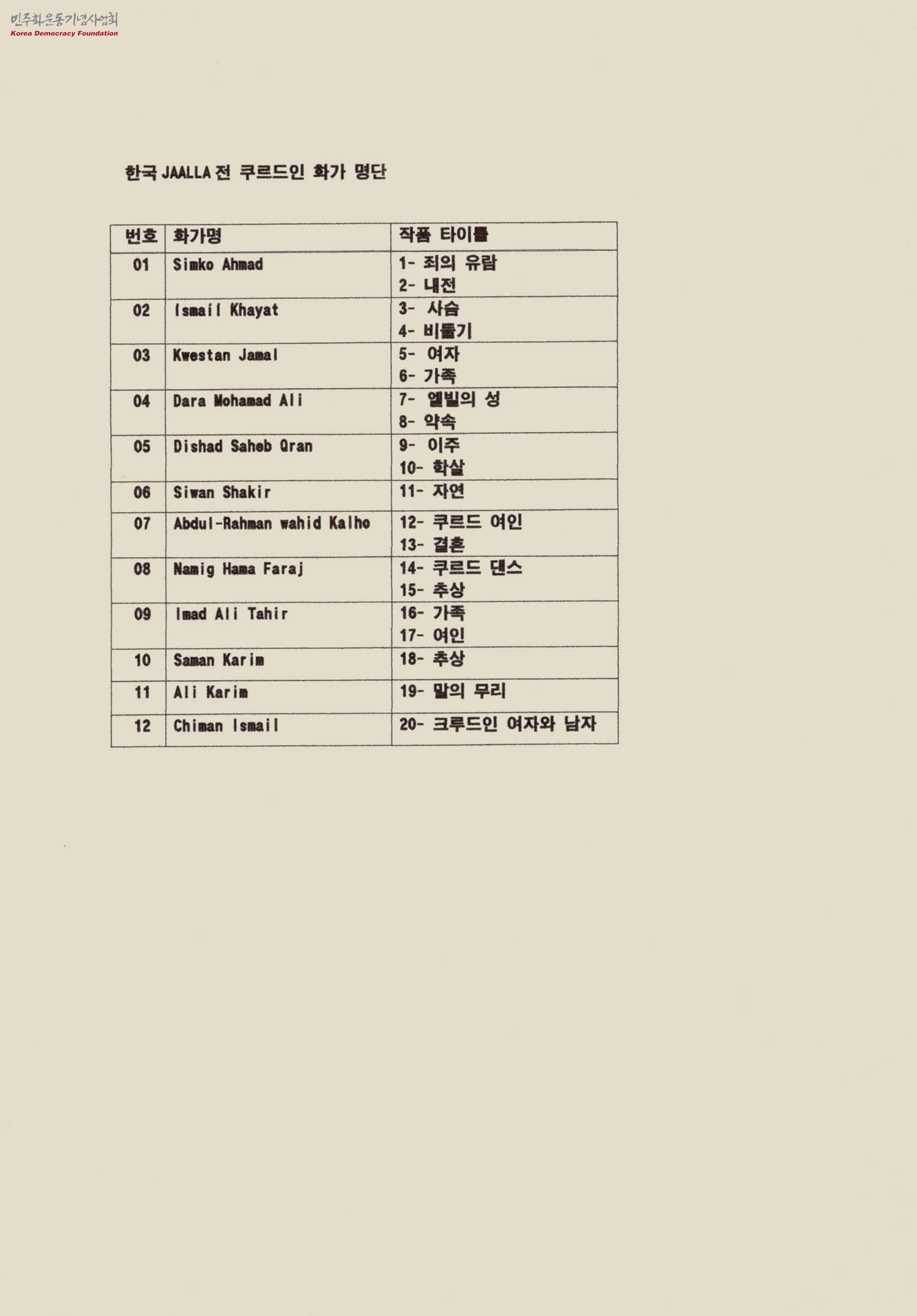 - 한국 JAALA전 쿠르드인 화가 명단으로 Simko Ahmad, Ismail Khayat 등 12명의 화가연혁과 20개의 작품의 정보가 담겨 있음