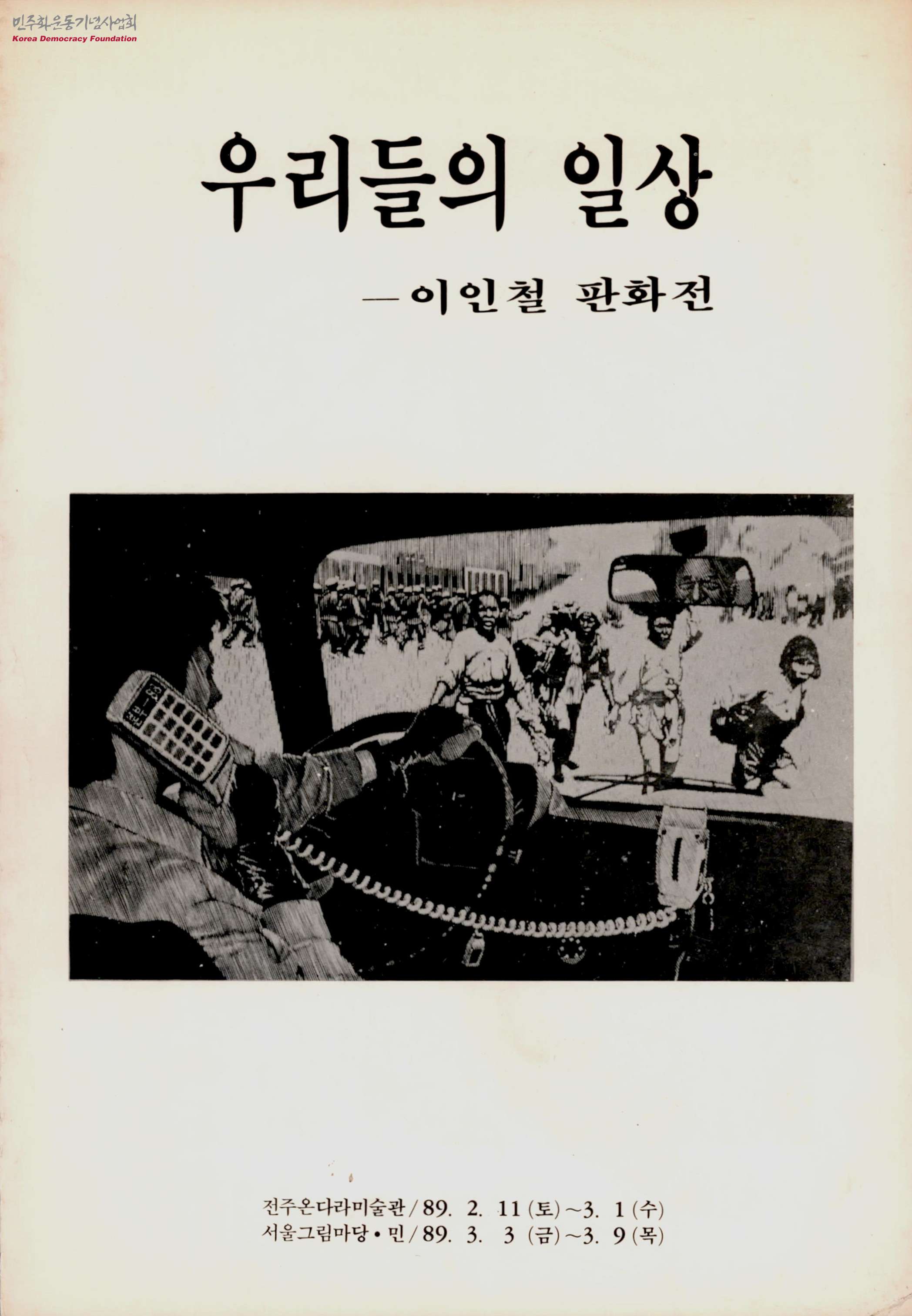- 이인철 판화전 우리들의 일상의 안내문으로 무모하고 허망하고 당혹스런 앙금을 독자에게 안겨주지만 소박스럽고 꼼꼼한 작업을 통해 나온 판화들의 전시로 화가 박불똥의 축전과 전주온다라미술관에서 89년 2월 16일부터 19일까지 진행되는 이인철의 판화교실, 서울 그림마당 민에서 89년 3월 3일 진행되는 빈민여성 빈민아동의 저자 강명순의 슬라이드 상영 '이땅의 예수' 예고와 온다라 미술관, 그림마당 민의 약도 등이 담겨 있음