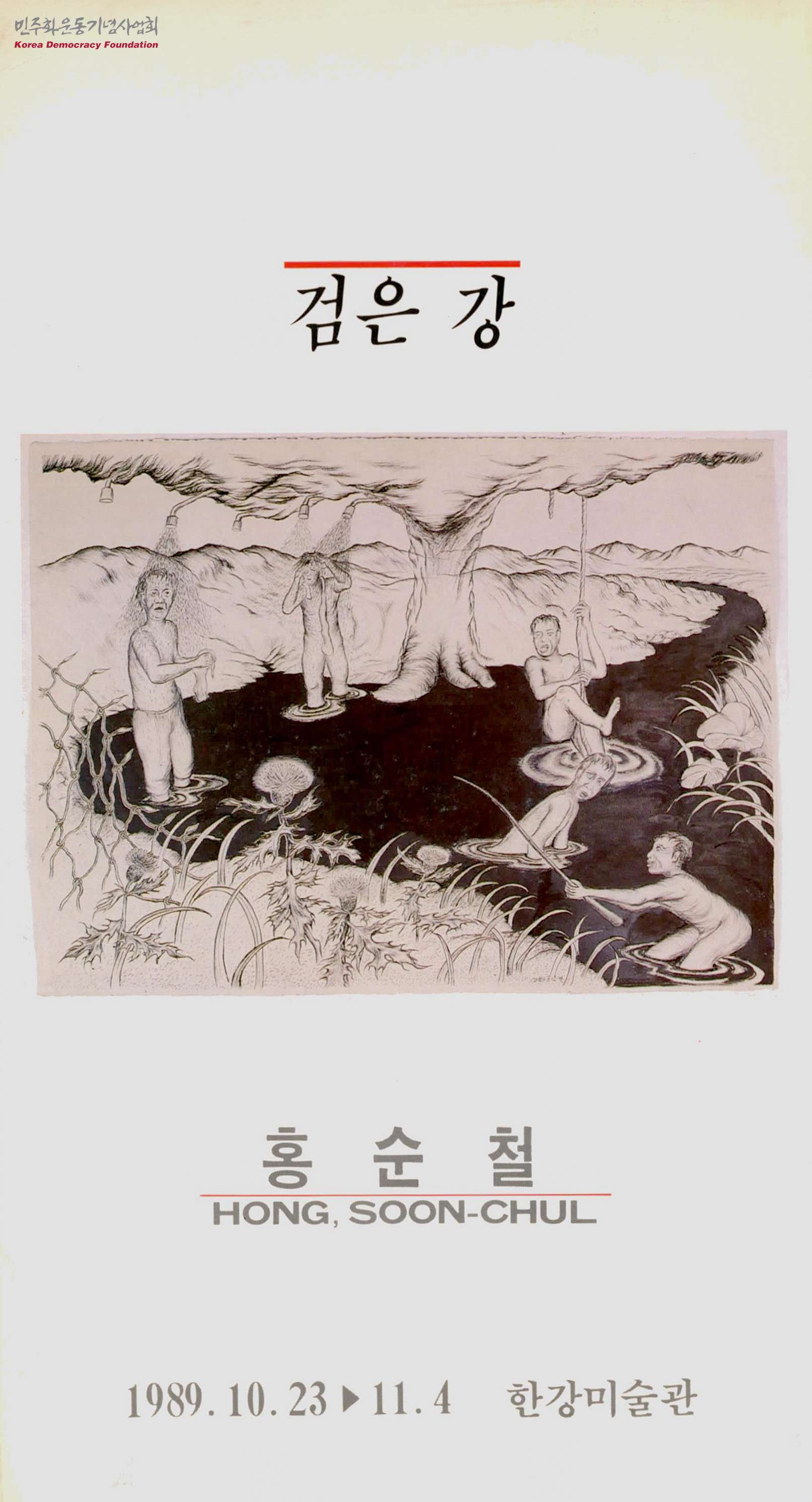 - 1989년 10월 23일부터 11월 4일까지 한강미술관에서 개최되는 홍순철의 검은 강 전시 안내문으로 5점의 작품들과 작가의 약력, 한강미술관의 약도가 담겨 있음
