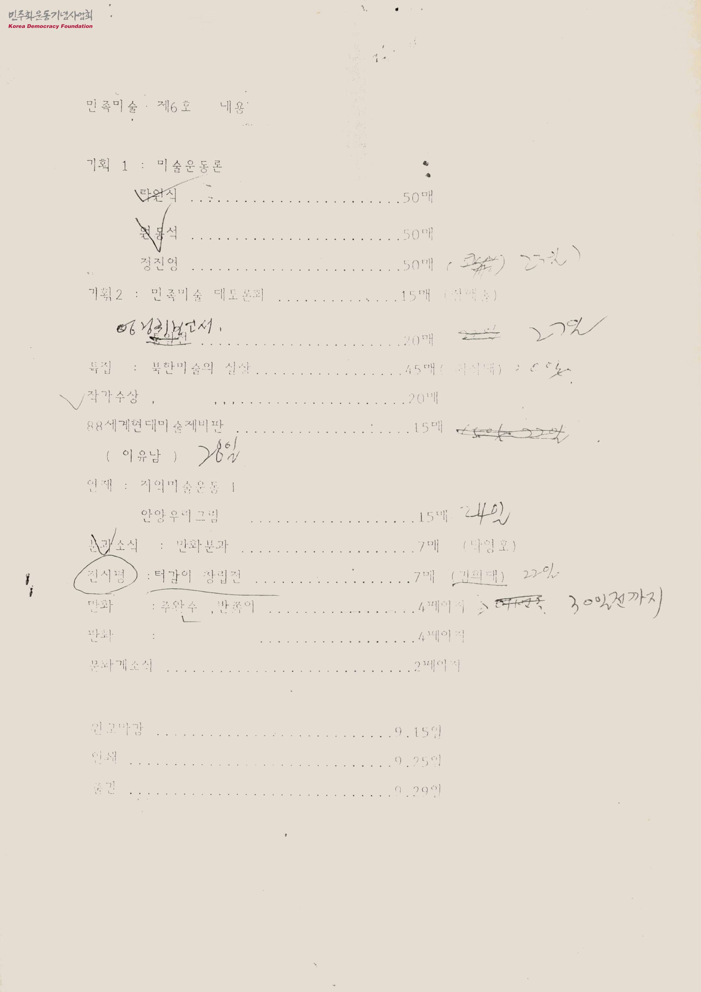 - 민족미술 제6호의 내용이 담긴 문서로 미술운동론과 민족미술 대토론회의 2개의 기획기사 구성과 특집 : 북한미술의 실상, 작가수상, 88세계현대미술제비판, 지역미술운동, 안양우리그림 등의 기사와 구성내용, 분량과 원고마감, 인쇄, 출간 일 등이 담겨 있음