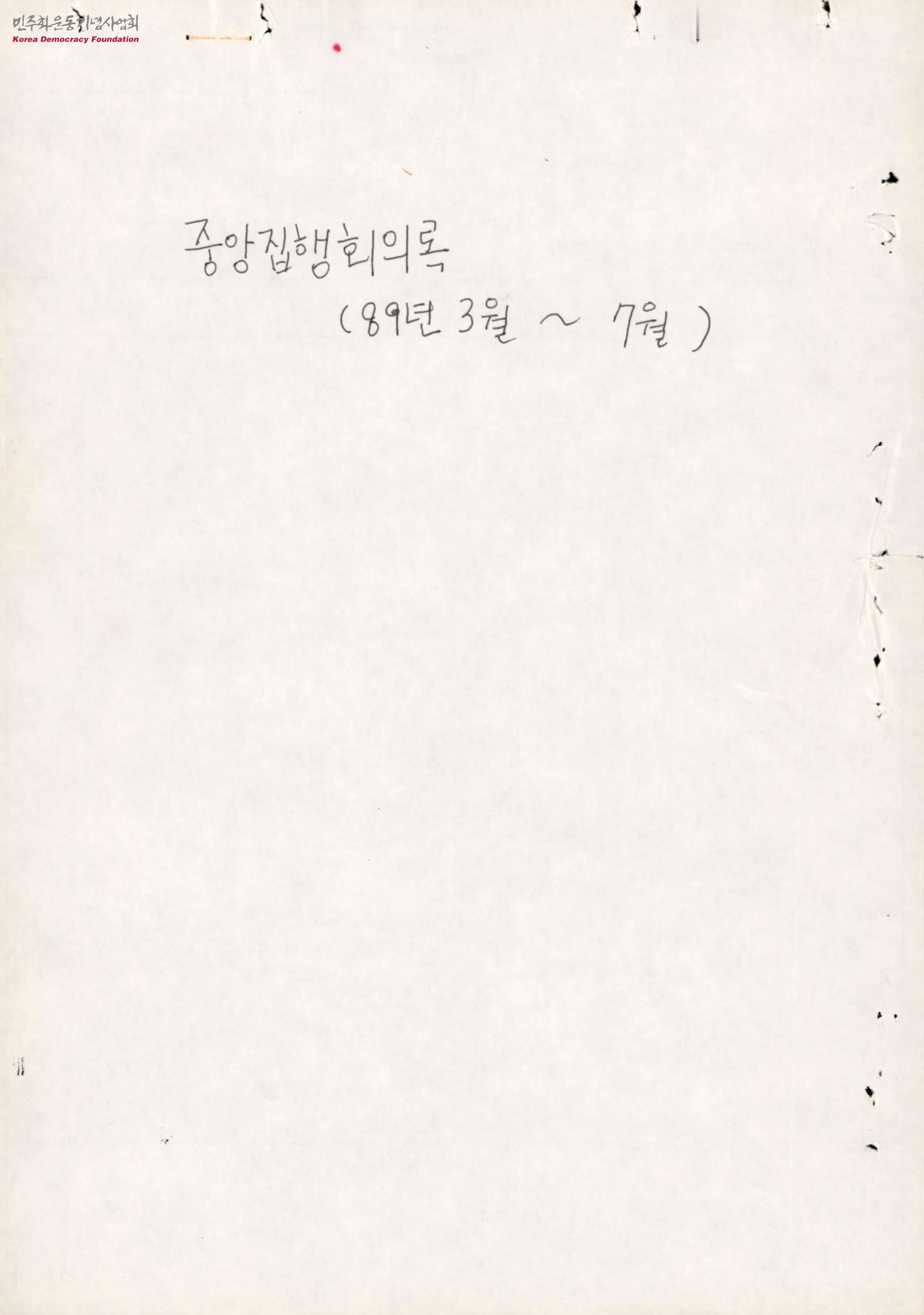 - 1989년 3월부터 7월까지 1차부터 8차까지 중집회의와 1차부터 2차 중앙위, 중접위 연석회의 등의 중앙집행회의록이며, 주요 내용으로는 민미협과 경기민미 공실위 예비회담 경과보고서와 평양축전 참가투쟁을 위한 미술사업에 관한 건과 관련 내용 등이 담겨 있음