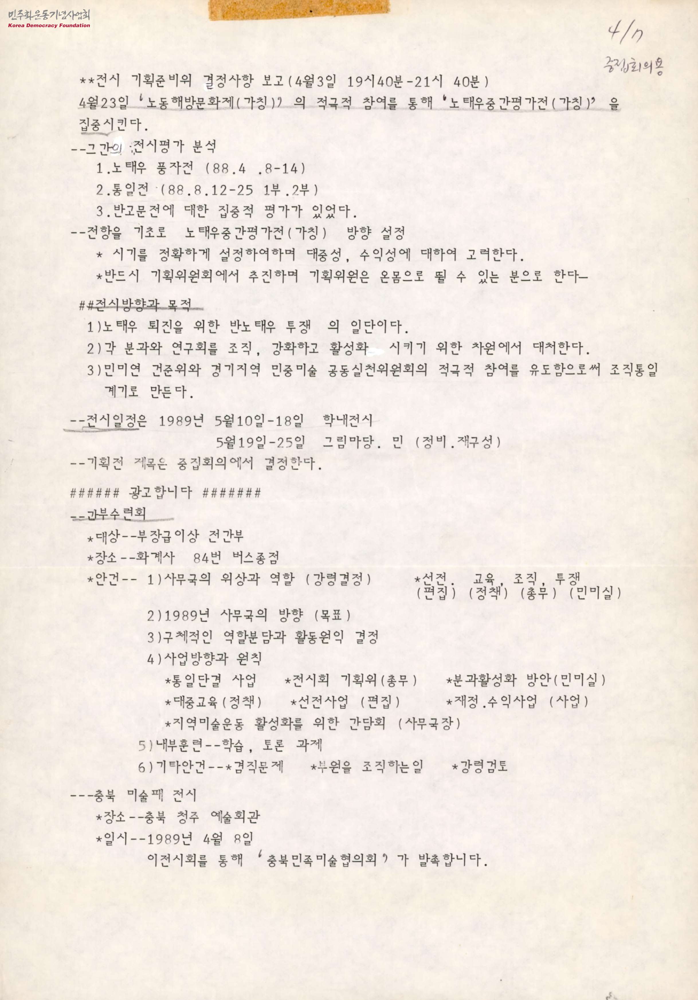 - 1988년 4월 3일 전시 기획준비위 결정사항 보고서로 노태우 풍자전과 통일전, 반고문전에 대한 집중적 평가로 노태우 평가전의 방향 설정에 대해 반노태우 투쟁의 일단이며 각 분과와 연구회를 조직하고 활성화 시키기 위한 차원에서 대처하고 민미연 건준위와 경기지역 민중 미술 공동실천위원회의 적극적 참여를 유도하고 조직 통일을 계기로 만드는 등의 내용이 담겨 있음