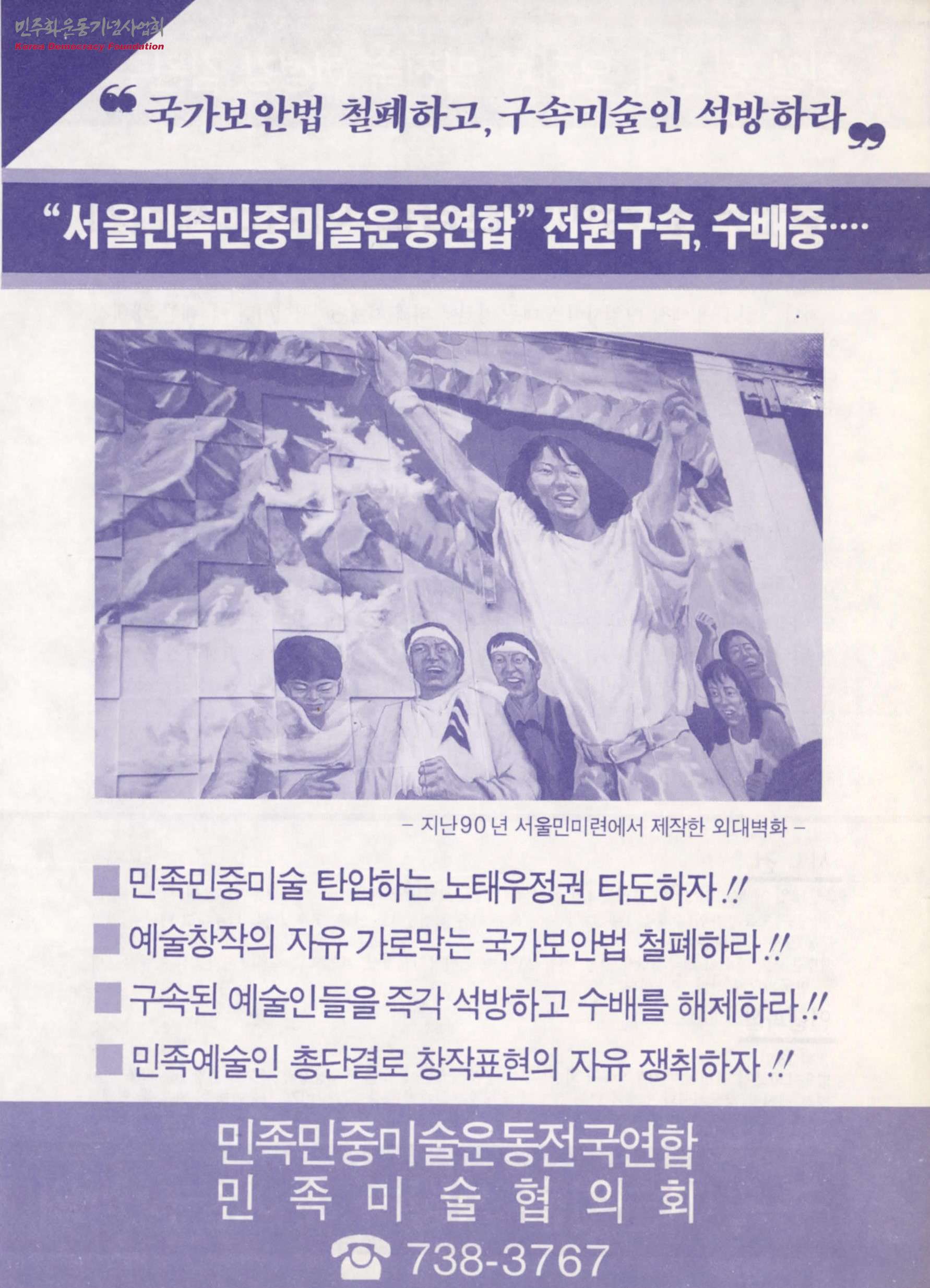 - 국가보안법의 철폐와 구속미술인에 대한 석방을 위한 포스터로 90년 서울민미련에서 제작한 외대벽화의 모습과 민족민중미술을 탄압하는 노태우 정권, 표현의 자유를 보장하라는 글, 서울민족민중미술연합에 대한 탄압을 규탄하는 민미련 수배자 일동의 글 등이 담겨 있음