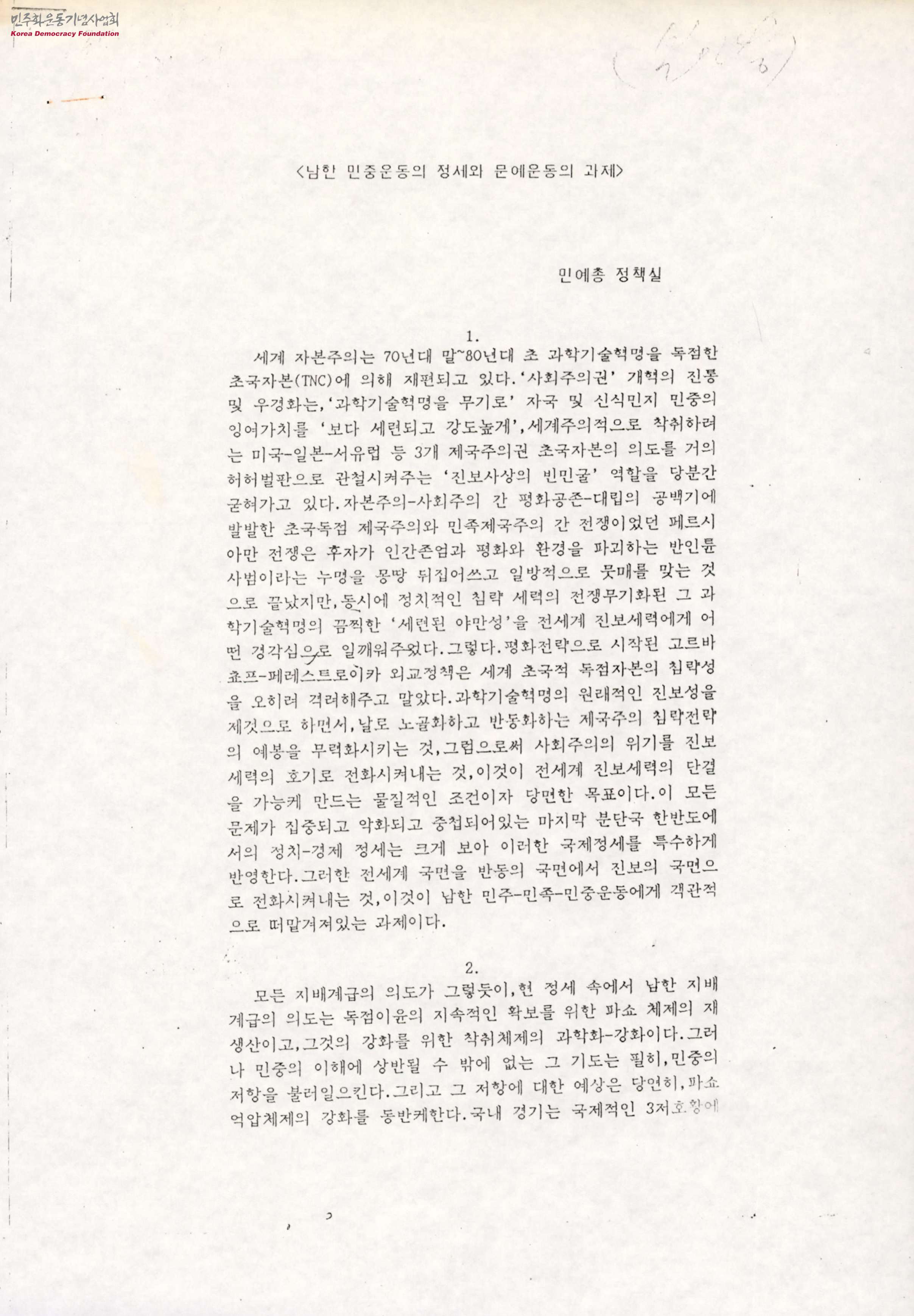 - 1991년 4월 9일 민예총 정책실에서 작성한 남한 민중운동의 정세와 문예운동의 과제 발제문으로 사회주의권의 몰락을 통해 미국과 남한의 독점자본의 이해에 맞는 당시 정권의 반민중적인 통일정책과 통일운동을 탄압하는 실태를 비판하고 통일운동이 탄압당하며 대중적 쟁점이 된 현실에 맞게 본인들의 반미, 민족적통일운동을 전개한다는 내용이 담겨 있음
