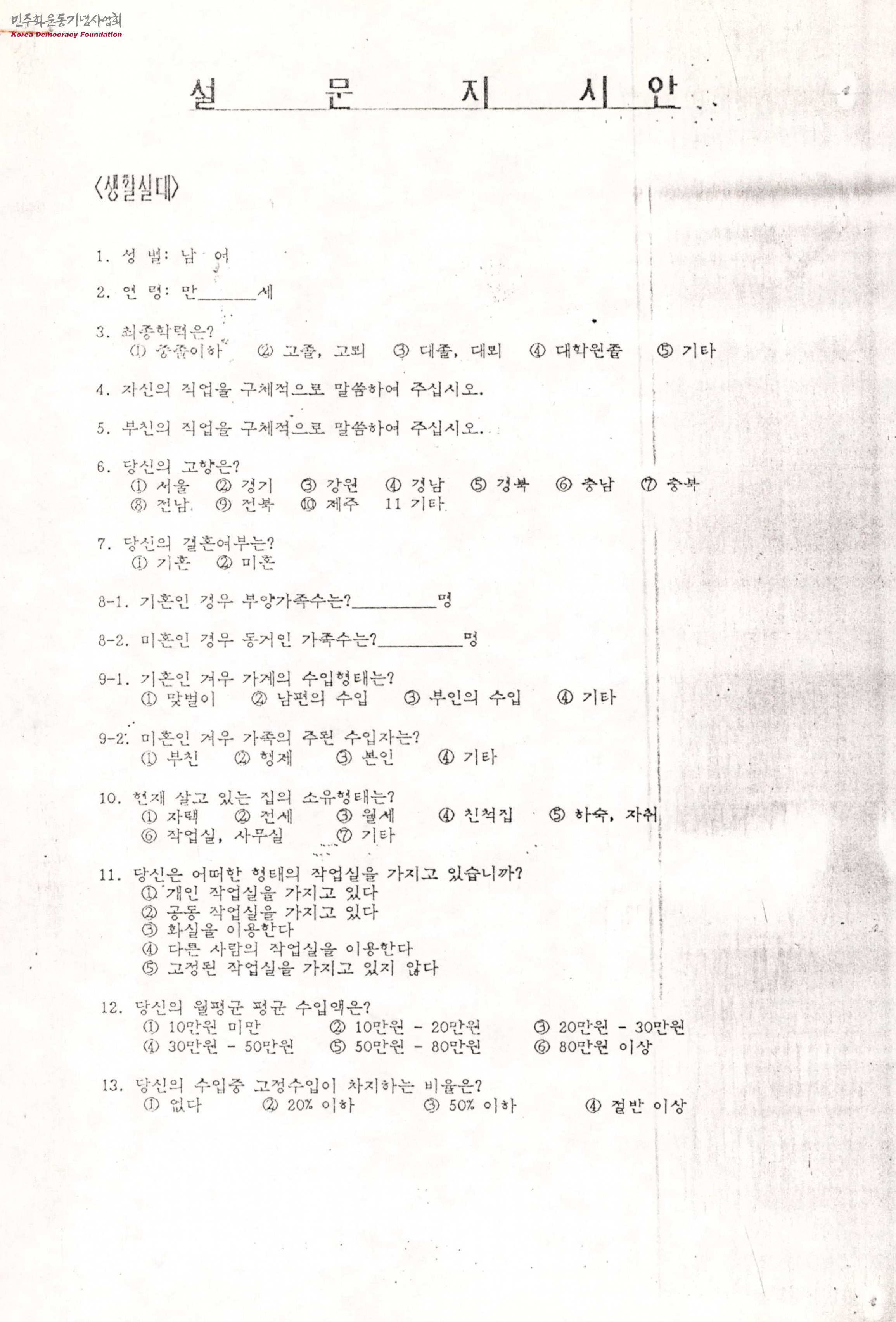 - 작가들을 대상으로 한 설문지안으로 생활실태, 그림마당 민 활동에 관한 실태조사서(안), 그림마당 민, 사무국활동, 교육위 설문지 시안, 편홍실 활동에 관한 설문의 내용이 담겨 있음