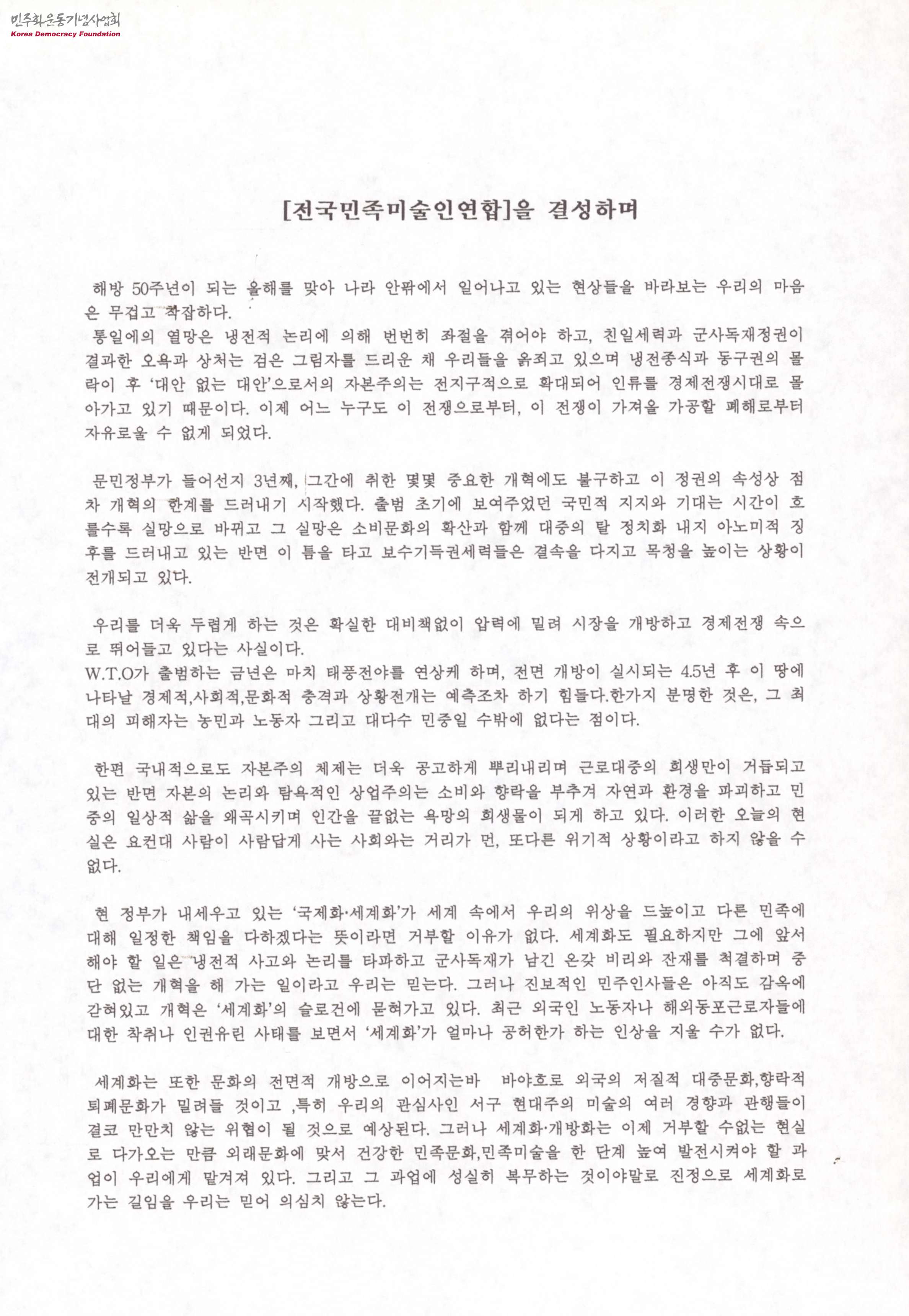 - 1995년 2월 25일 전국민족미술인연합 회원들에게 보낸 전국민족미술인연합을 결성하며라는 글로 21세기의 통일조국을 위해 침체국면에 있는 민족민주운동에 활력을 불어넣는 단합을 위한 민족미술인들의 결의 내용과 민족·민중의 입장에서 변혁적 이상을 추구하고 지역의 전통문화를 지키고 지역문화, 지방미술의 발전과 민족민주운동, 통일운동에 대한 독려가 담겨 있음
