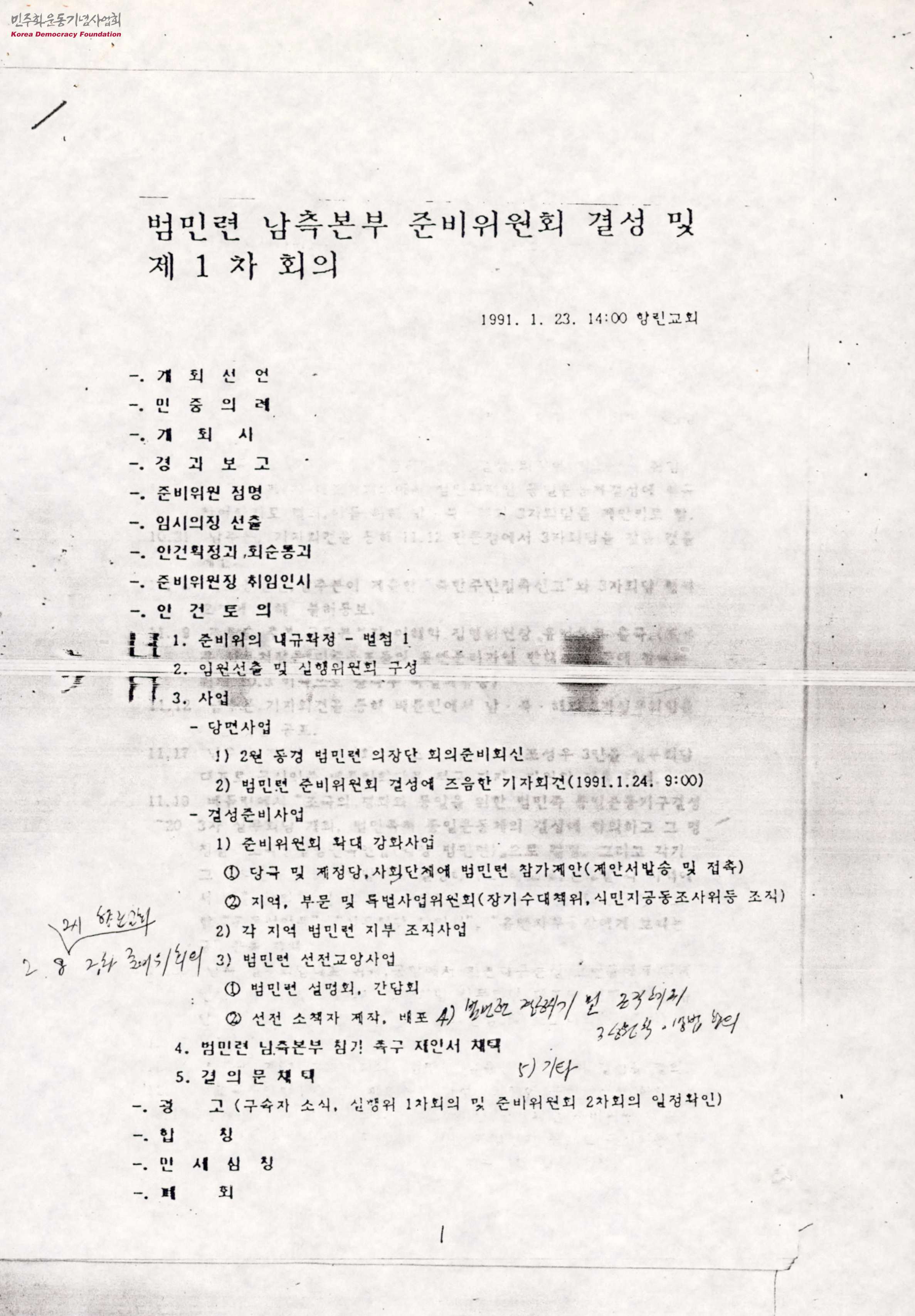 - 1991년 1월 23일 향린교회에서 진행된 범민련 남측본부 준비위원회 결성 및 제1차 회의록으로 식순은 개회선언, 민중의례, 개회사, 경과보고, 준비위원 점명, 임시의장 선출, 안건확정과 회순통과, 준비위원장 취임인사, 준비위의 내규확장과 임원선출 및 실행위원회 구성 등으로 구성되어 있음