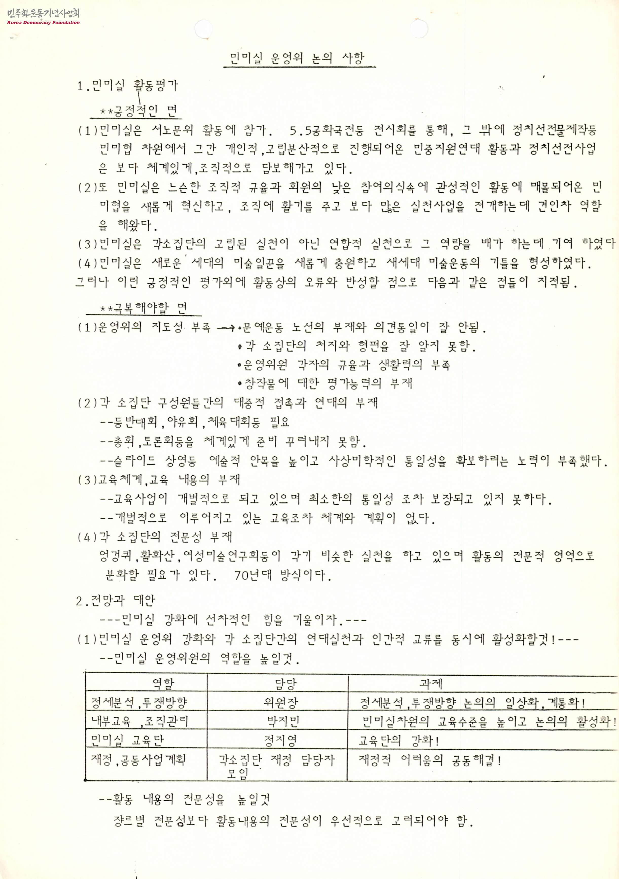 - 민미실은 서노문위 활동에 참가하여 정치선전사업을 체계적으로 진행하고 있으며, 연합적 실천으로 새 세대 미술운동의 기틀을 마련하였다는 긍정적인 면도 있지만, 운영위원의 지도성 부족, 대중적 접촉과 연대의 부재, 교육 체계 및 내용의 부재, 각 소집단의 전문성 부재 등의 문제로 인하여 운영에 모자람이 있었기에, 대중과의 교류 및 전문성 재고 방안을 마련해야 할 것이라는 내용이 담긴 문서