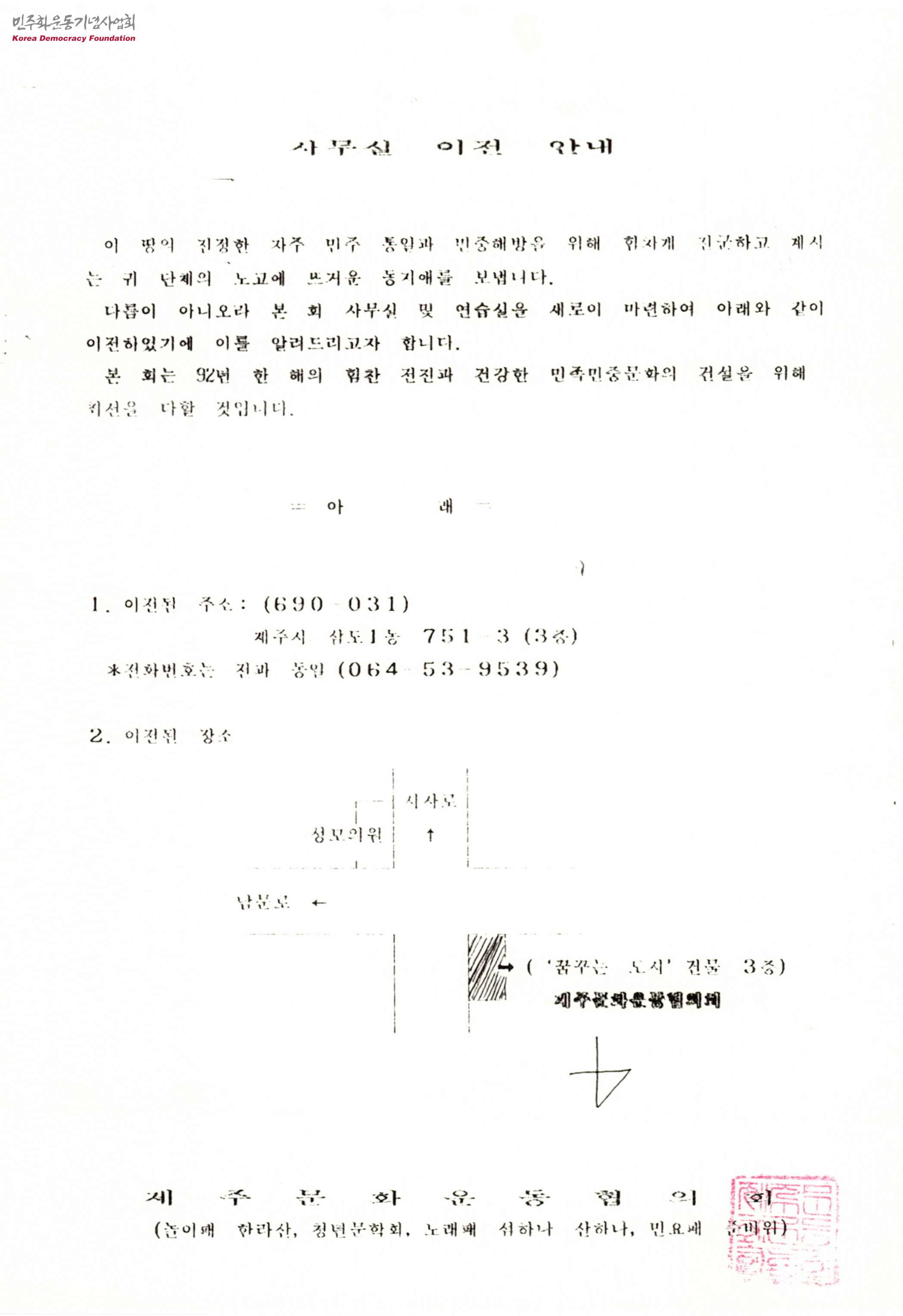 - 제주문화운동협의회가 사무실 및 연습실을 이전하게 되어 이전한 장소를 알리는 내용과 본 회는 1992년에도 힘찬 전진과 건강한 민족민중문화의 건설을 위해서 최선을 다할 것을 알리는 내용 등이 담긴 문서