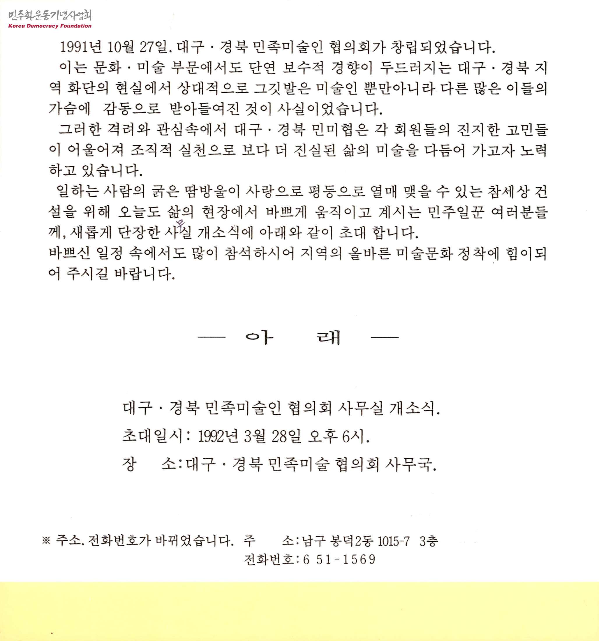 - 보수적 경향이 두드러지는 대구·경북 지역에 진보적 성향을 띠는 대구·경북 민족미술인 협의회가 1991년 10월 27일에 창립되었고, 이를 기념하여 개소식을 진행할 예정이니 많은 분들의 참여를 바란다는 내용이 담긴 초대장