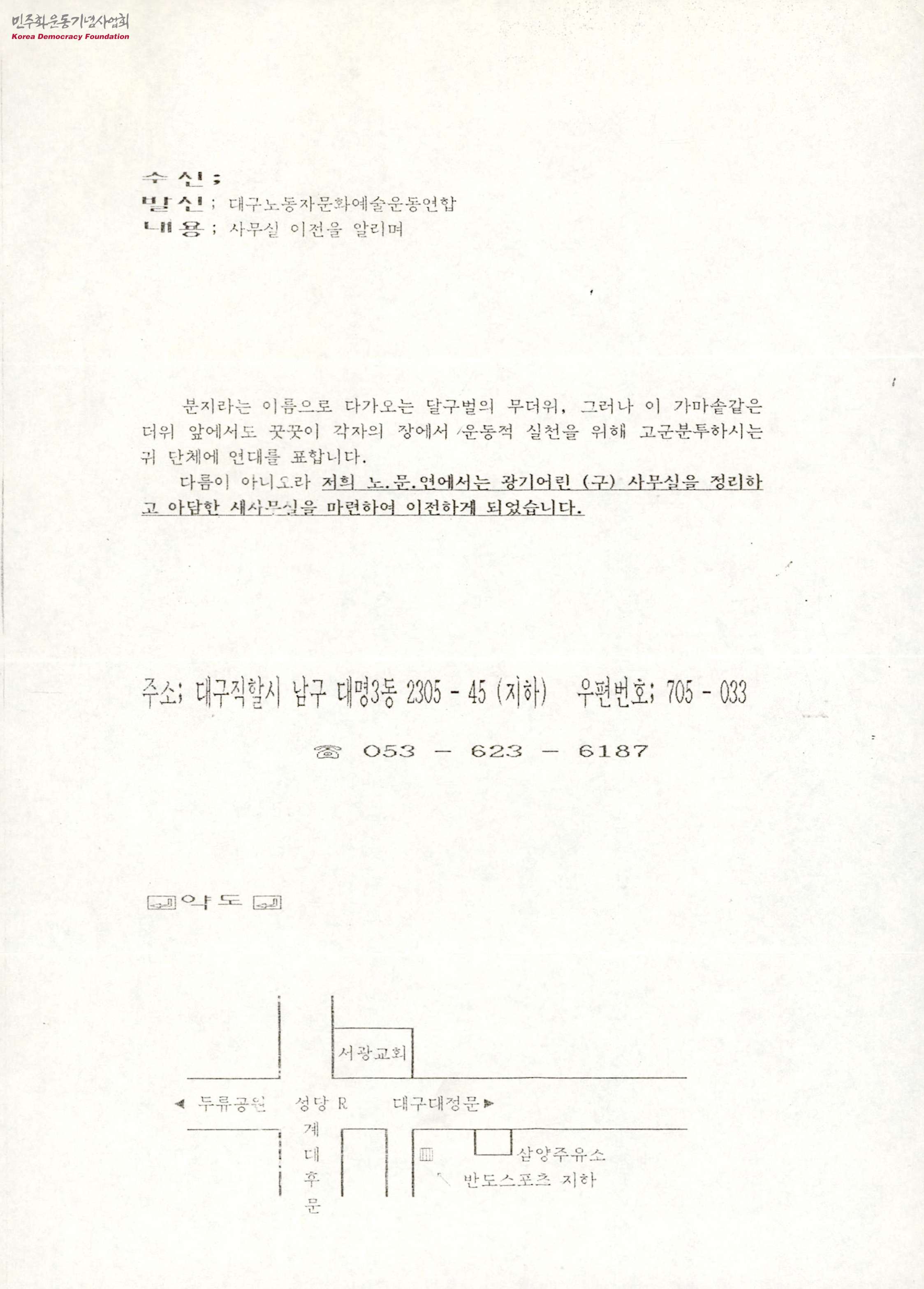 - 대구노동자문화예술운동연합은 기존 사무실을 정리하고 새 사무실을 마련하여 이전하게 되었기에 이를 알리는 내용의 글