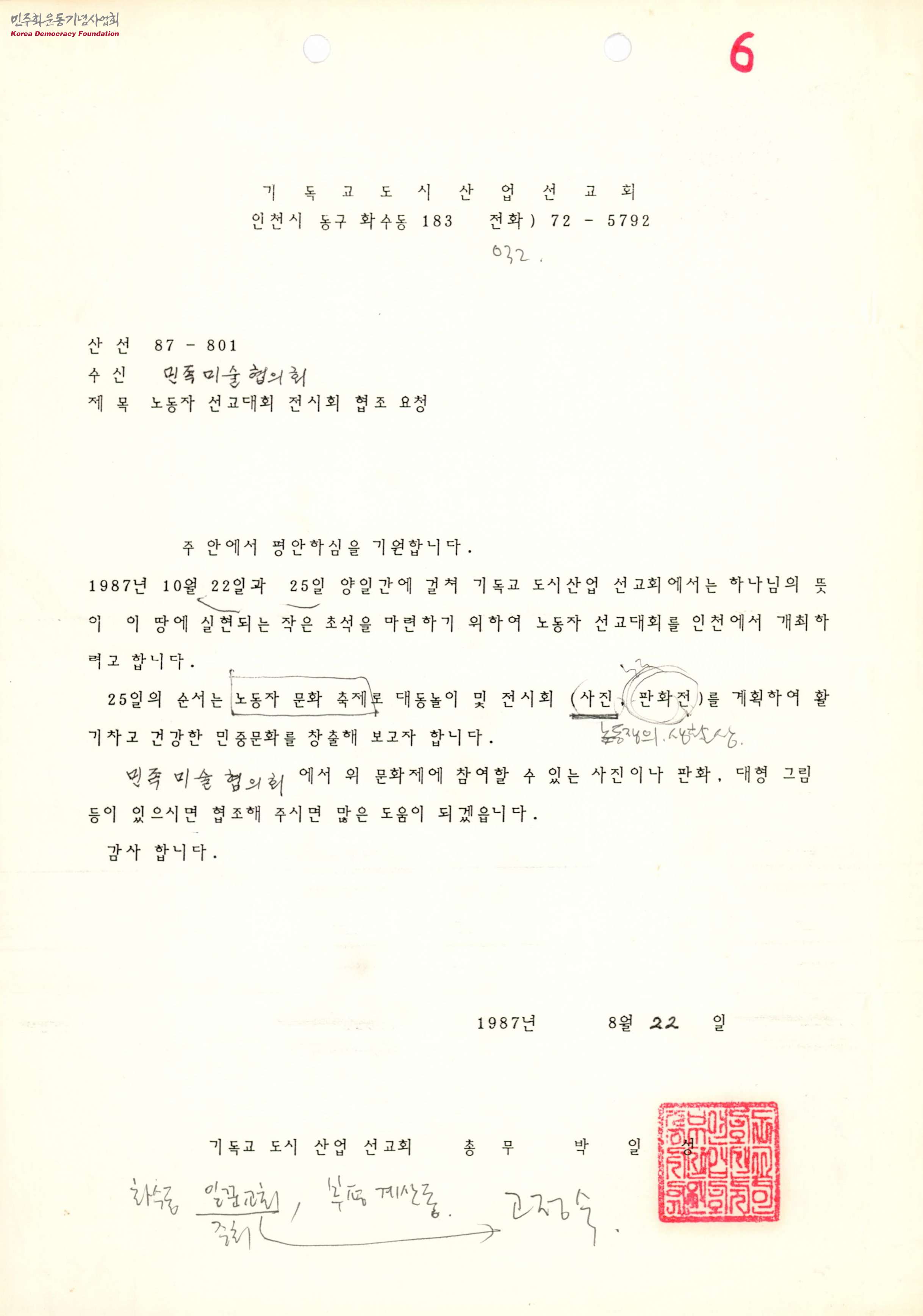 - 1987년 10월 22일과 25일 양일간 기독교 도시산업 선교회는 노동자 선교대회를 인천에서 개최할 예정이며, 그중 25일은 노동자 문화 축제를 개최할 예정이며 해당 행사에서는 대동놀이 및 전시회를 기획중이니 민족미술협의회에서 위 행사에 참여할 수 있는 작품 등을 협조해 주길 바란다는 내용의 글
