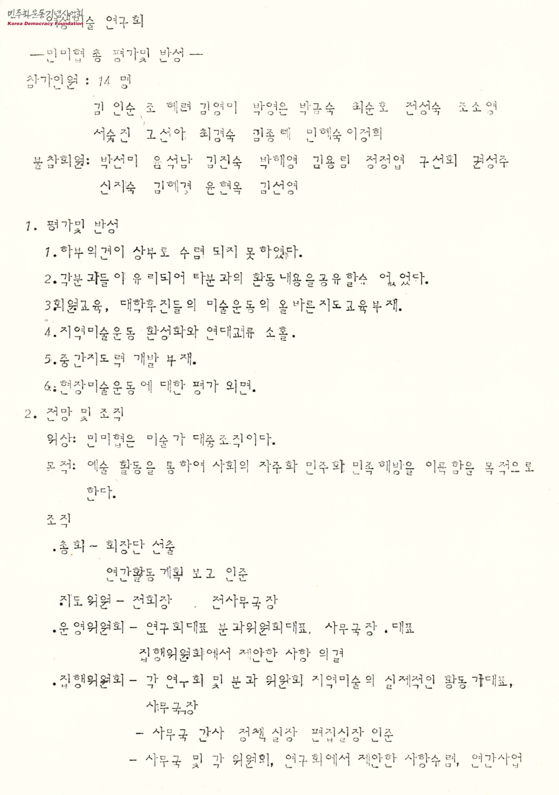 - 민족미술협의회는 각 분과들이 서로 유리되어 있어 서로 간의 연대 및 공유, 원활한 소통 등이 불가능하였다는 여성미술분과의 평가 내용과 1988년 민미협 미술분과 전체 활동에 대한 평가의 내용 등이 담긴 문서