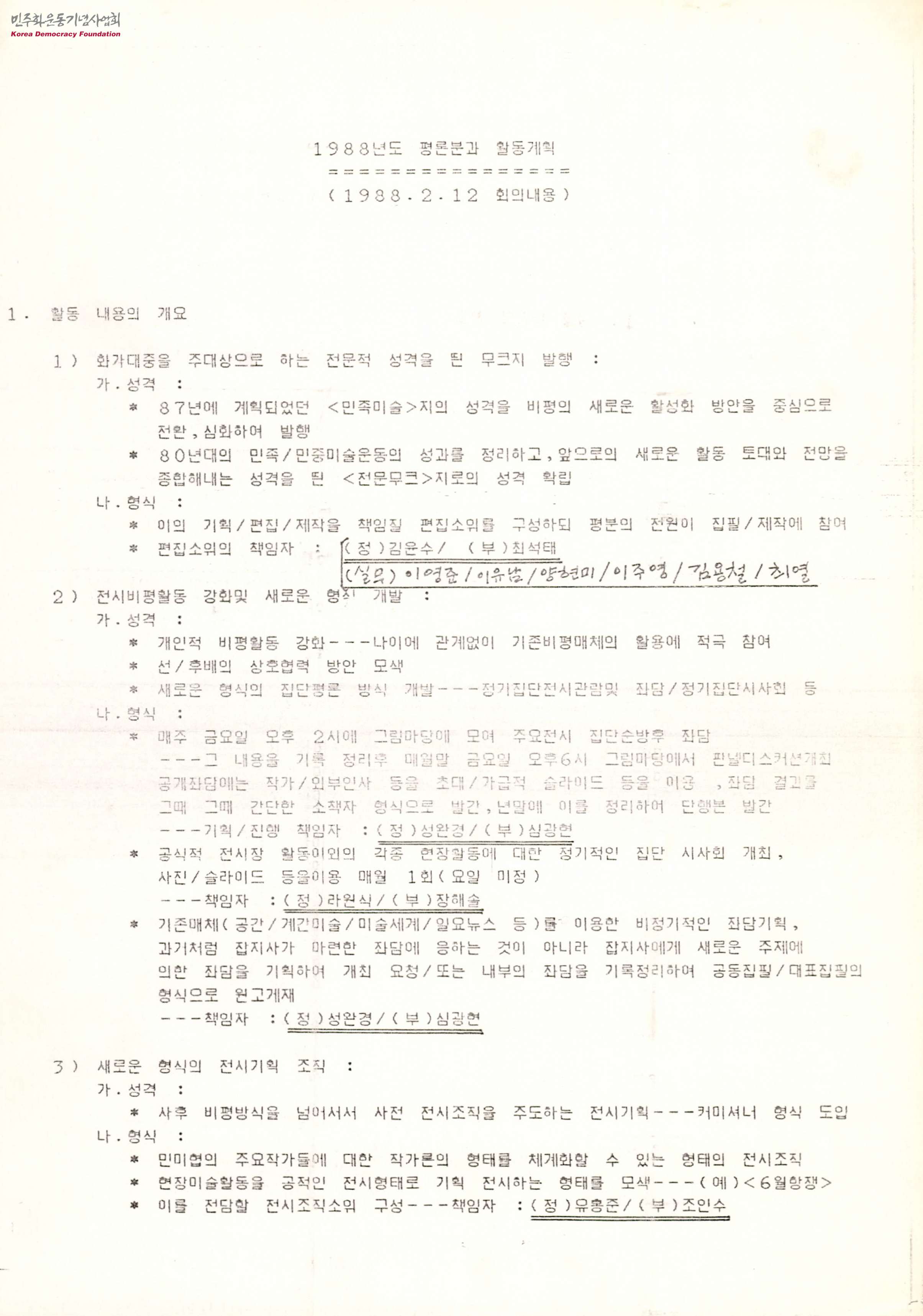 - 1988년 평론분과는 화가를 대상으로 하는 전문적 무크지 발행, 전시비평 강화 및 새로운 형식 개발, 새로운 전시기획 조직, 교육조직 활동 강화, 현장지원 활동 강화 등의 활동을 전개할 예정이며, 모임을 강화하고 재정 체제를 정비하여 활동의 기구적 틀을 개선하겠다는 내용 등이 담긴 문서