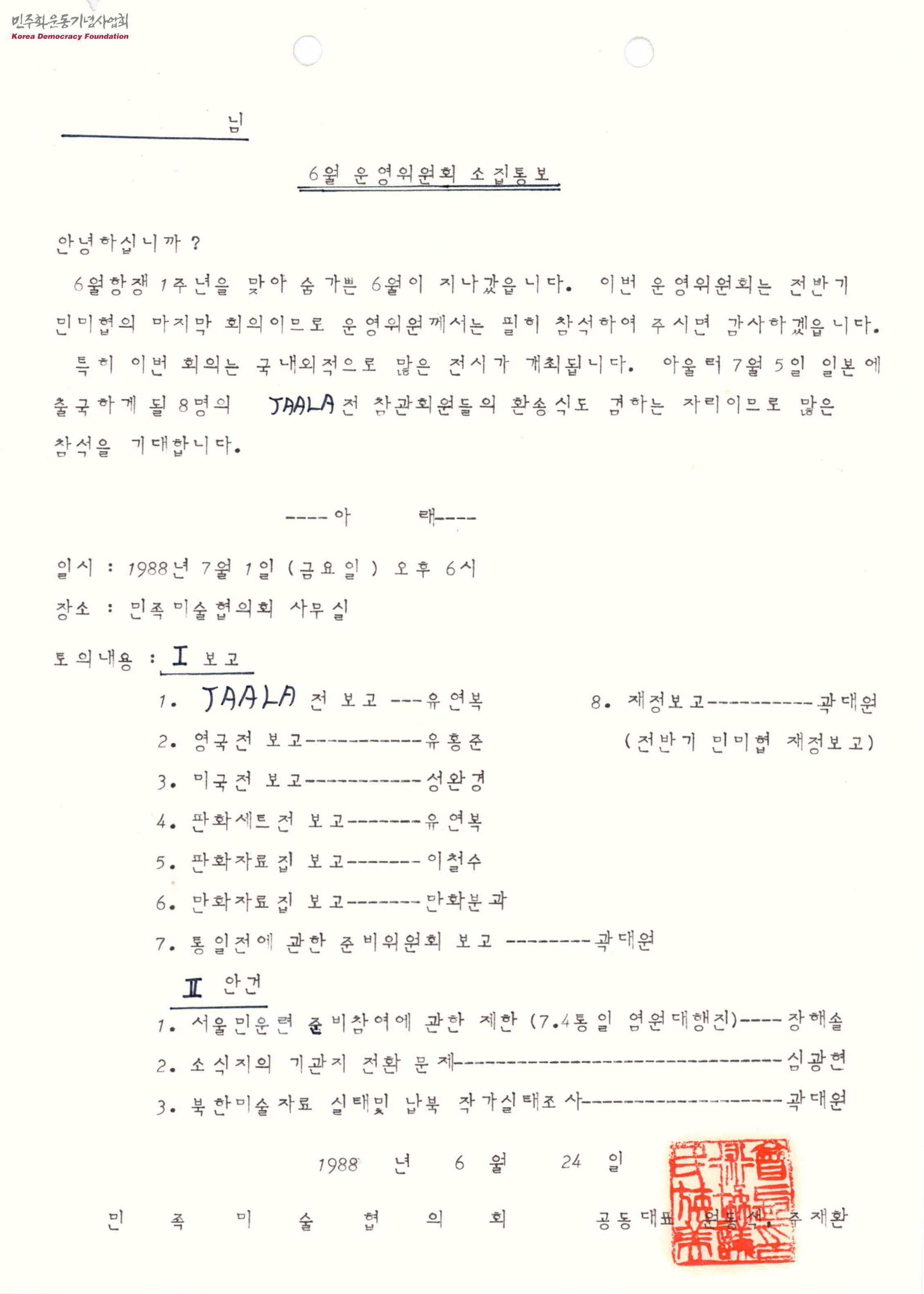 - 1988년 7월 1일 민족미술협의회 사무실에서 JAALA전 보고, 영국전 보고 등 8개 토의 내용과 서울민운련 준비참여에 관한 제안, 소식지의 기관지 전환 문제 등 3개 안건에 대해 운영위원회 회의가 있을 예정이니 운영위원들은 필히 참여해 달라는 내용의 문서