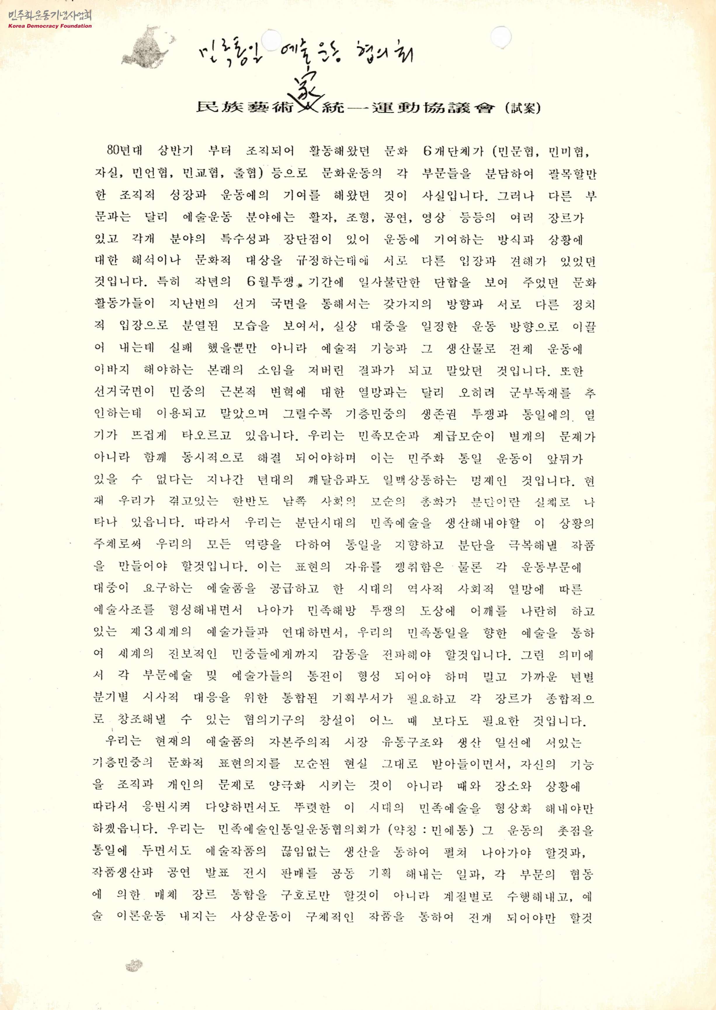 - 1980년대 상반기부터 민문협, 민미협, 자실, 민언협, 민교협, 출협 6개 단체는 문화운동의 각 부문들을 분담하여 조직적 성장과 운동에 기여하였으나, 각 분야의 특수성과 운동에 기여하는 방식이 서로 달라 대중들의 일정한 운동 방향을 이끌어 내는 데 실패하였기에, 이제는 민족예술인통일운동협의회를 발족하여 통일된 조국의 민중이 엄숙하게 요구할 민족예술의 생산자가 될 것임을 선언하는 내용의 글