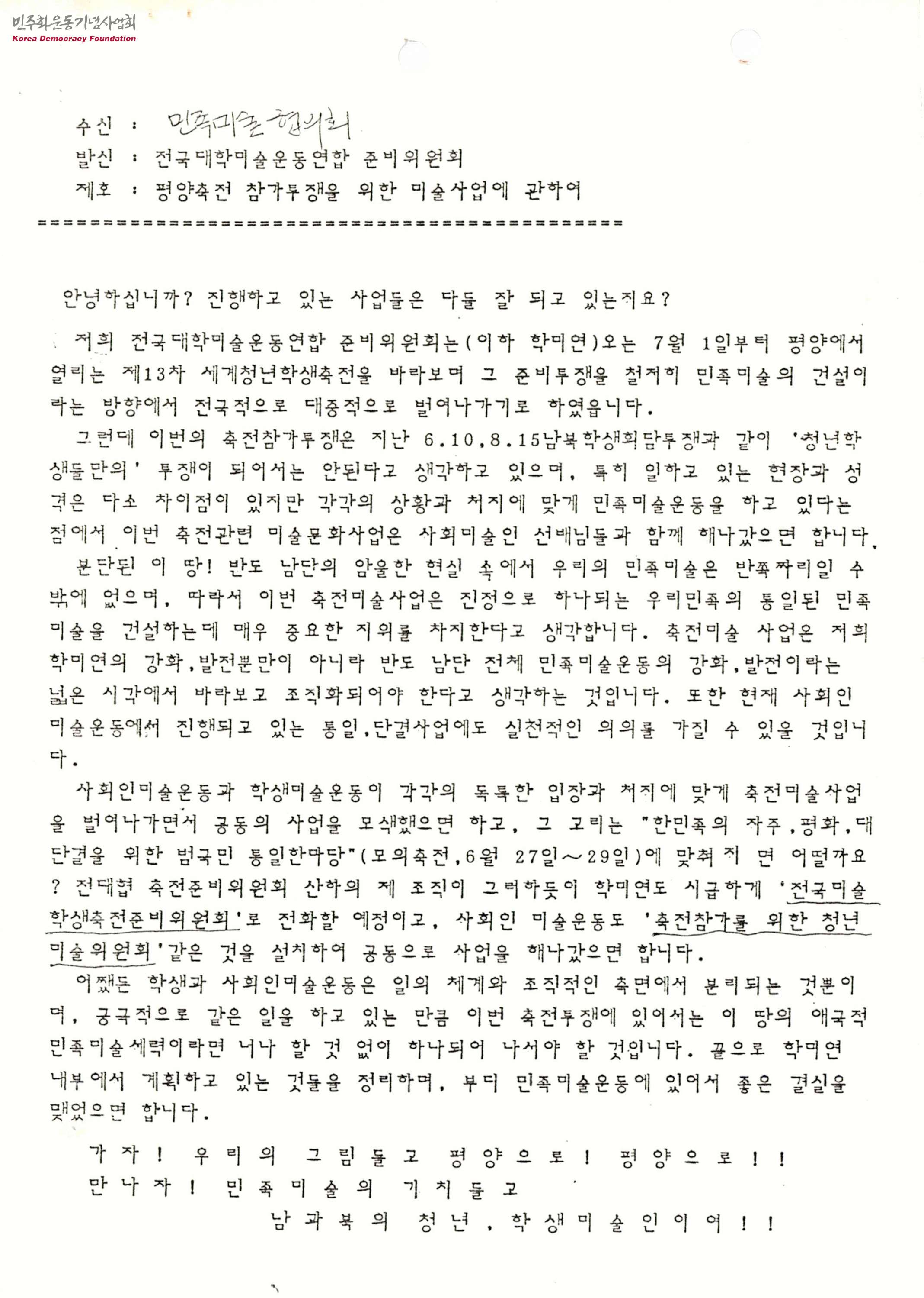 - 전국대학미술운동연합 준비위원회는 1989년 7월 1일부터 평양에서 열리는 제13차 세계청년학생축전을 목표로 그 준비투쟁을 철저히 민족미술의 건설이라는 방향에서 전국적으로 벌여나가기로 하였는데, 이 운동을 민족미술협의회에서 같이 해 주었으면 한다는 내용 등이 담겨 있는 문서
