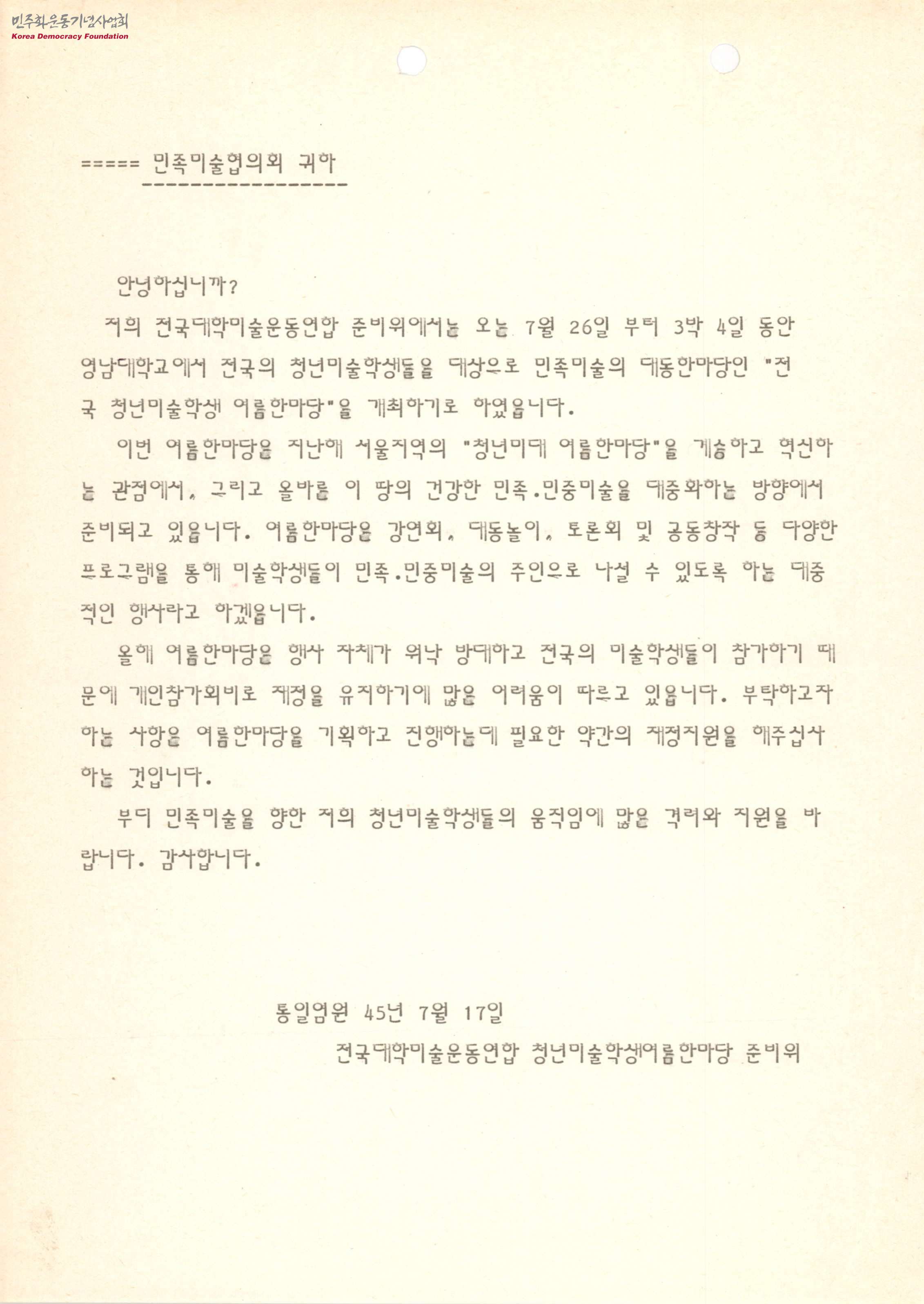 - 전국대학미술운동연합 준비위는 이 땅의 올바르고 건강한 민족 민중미술을 대중화하기 위한 '전국 청년미술학생 여름한마당'을 개최하기로 하였으나, 전국의 미술학생들이 참가하기 때문에 재정적 어려움이 있어 재정 지원을 요청하는 내용의 글